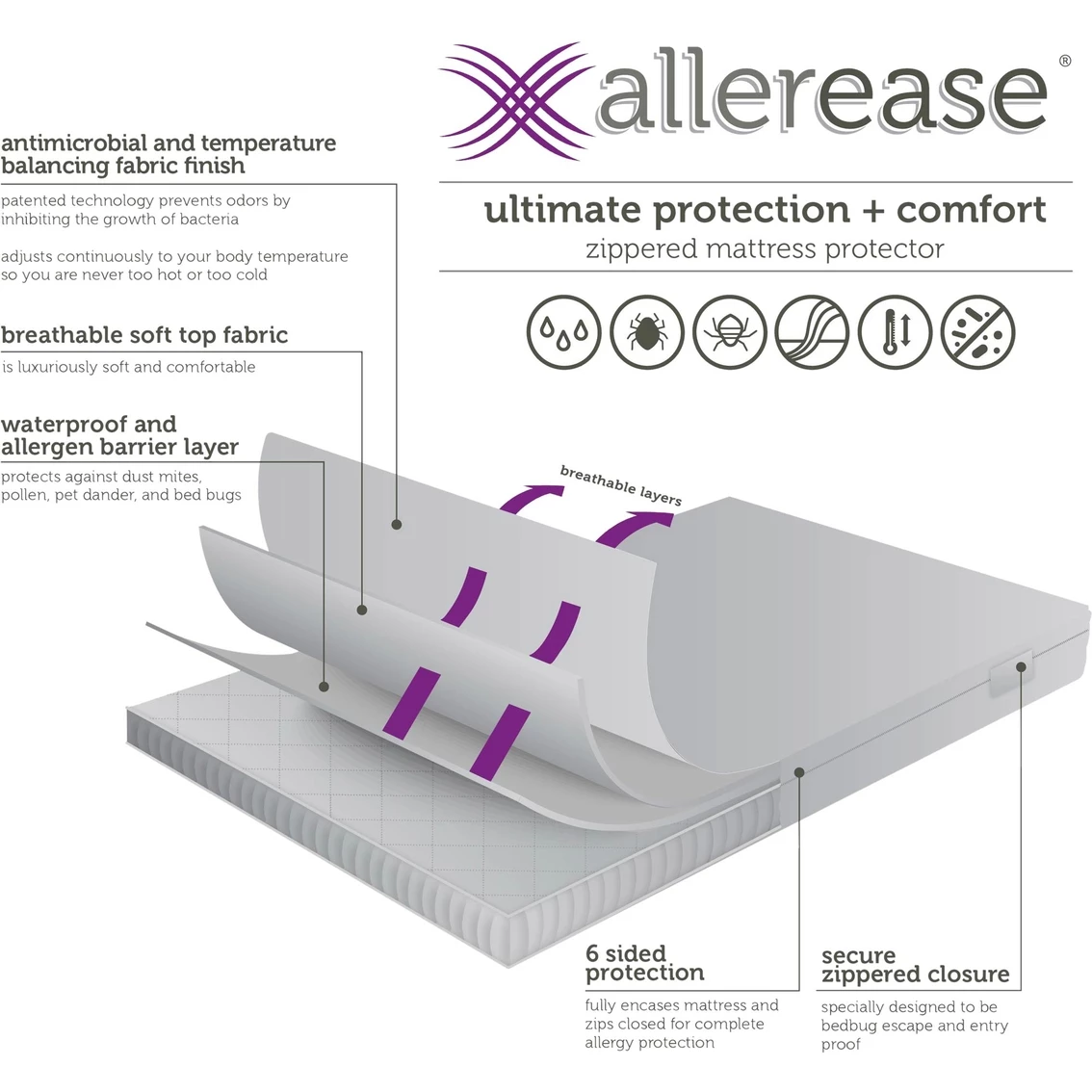 The AllerEase Ultimate Protection and Comfort Temperature Balancing Mattress Protector was made for those who don’t want to sacrifice comfort for protection. The comfortable, soft top fabric won’t alter the feel of your mattress, while innovative temperature balancing technology adjusts continuously to your body temperature so that you are never too hot or too cold. As always, this AllerEase mattress protector provides unsurpassed protection from dust mites, pollen, bed bugs, pet dander and other household allergens that can trigger allergies. Model: 3514ATC.