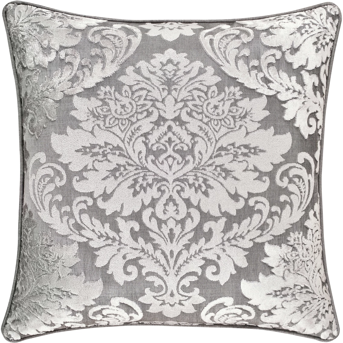 The Bel Air Silver Square Decorative Throw Pillow from J. Queen New York includes a large centered damask and reverses to a diamond coordinate. The 18 in. pillow is finished with the fine solid cord. Style: 219804618SQ.