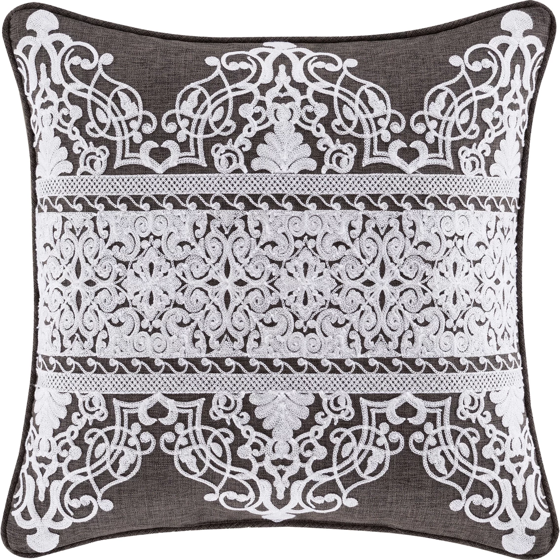 The 20-in. decorative throw pillow from J. Queen New York features a heather charcoal gray colored faux linen fabric with a white embroidered damask on the face. The pillow reverses to a gray colored faux linen with corded edge for added detail. Style: 263908120SQ.