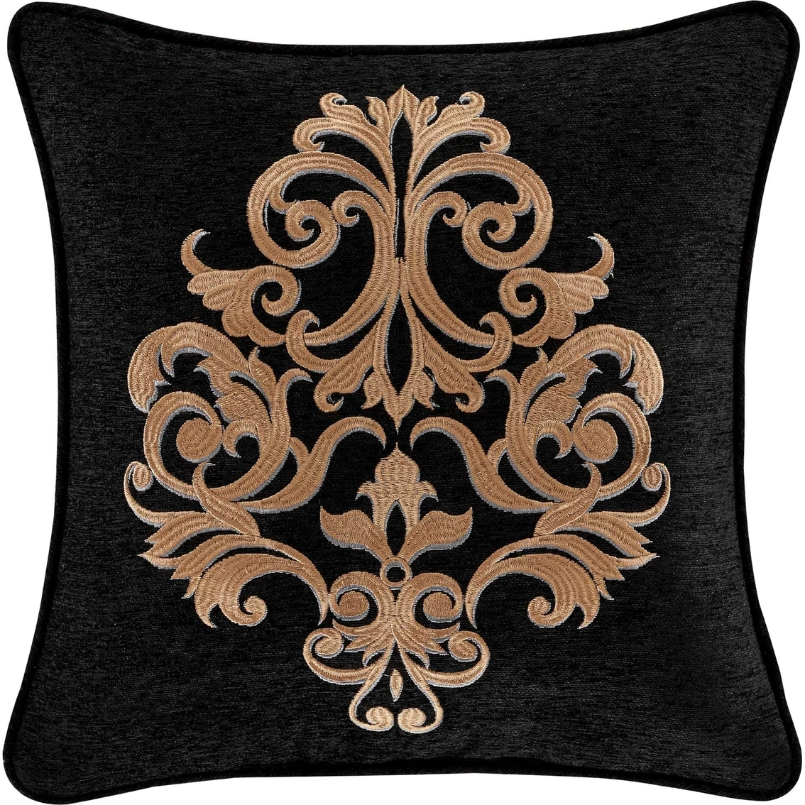 The Lauretta 18-in. decorative throw pillow from J. Queen New York is elegantly designed with a solid black chenille base fabric with a grand scale gold embroidered damask. Details include a slate embroidered outline creating a shadow effect for added dimension.
