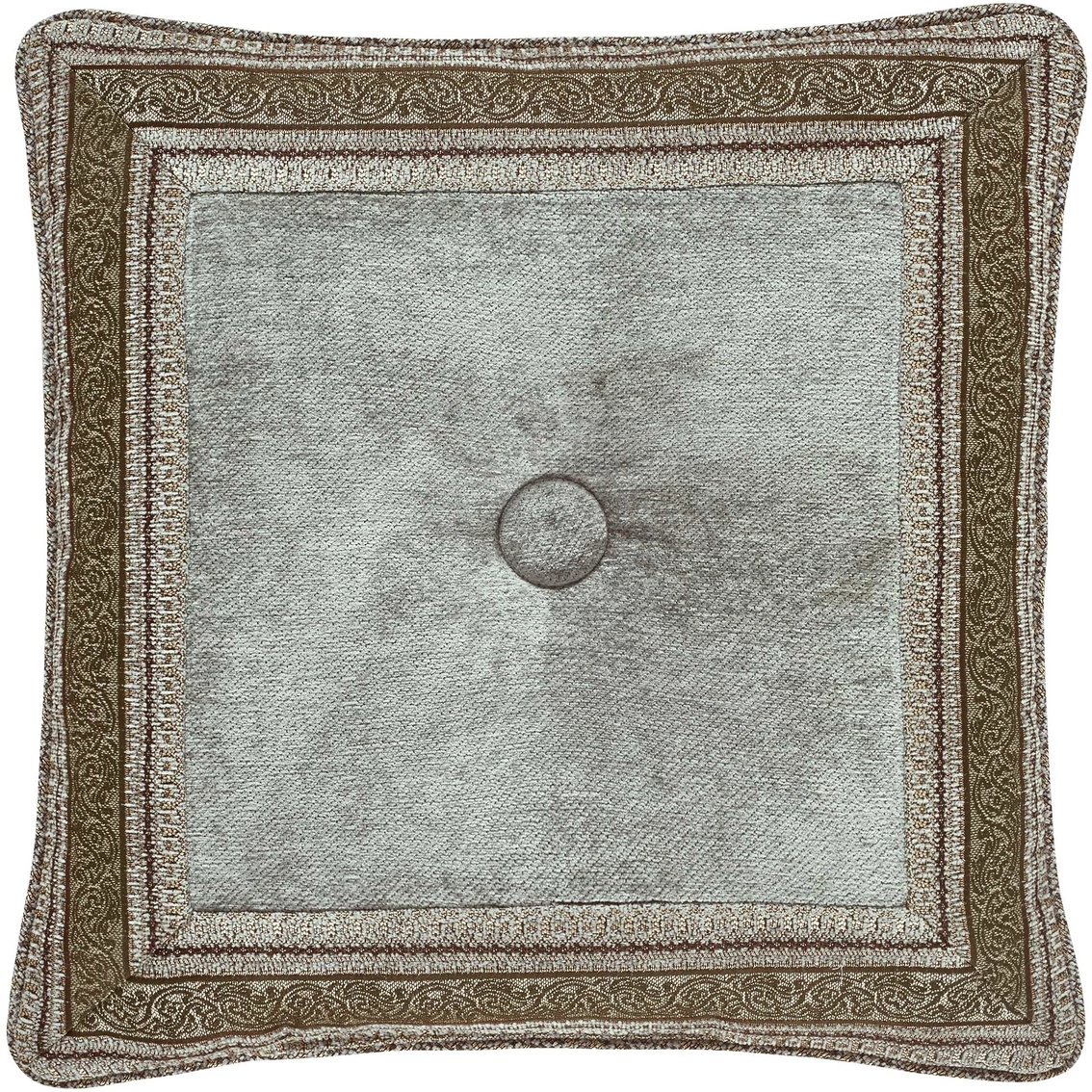 This Provence 16 x 16 in. Decorative Pillow from J. Queen New York is deeply tufted in the center of the stone chenille fabric, accented with a stone chenille fabric covered button and bordered by the woven scroll chenille stripe.