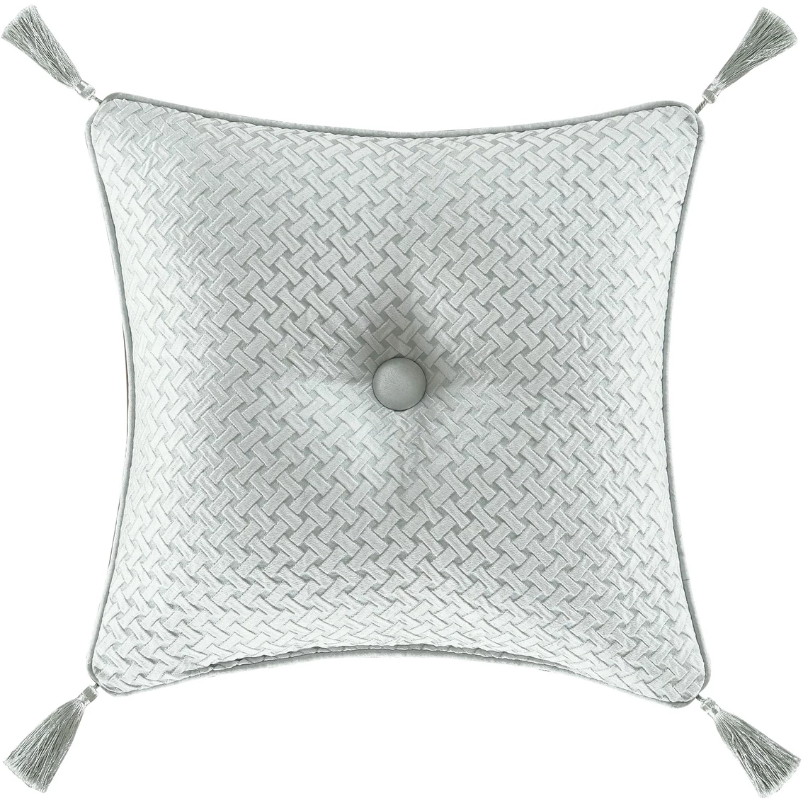 The Riverside 18-in. Decorative Throw Pillow from J. Queen New York is exquisite with its use of spa blue tones. This beautiful square accent pillow is constructed with a puff-texture basket weave with a deeply tufted button and reverses to a solid spa satin. This pillow is finished with a beautiful spa tassel detail on all four sides. Includes one pillow. Style: 263305418SQ.