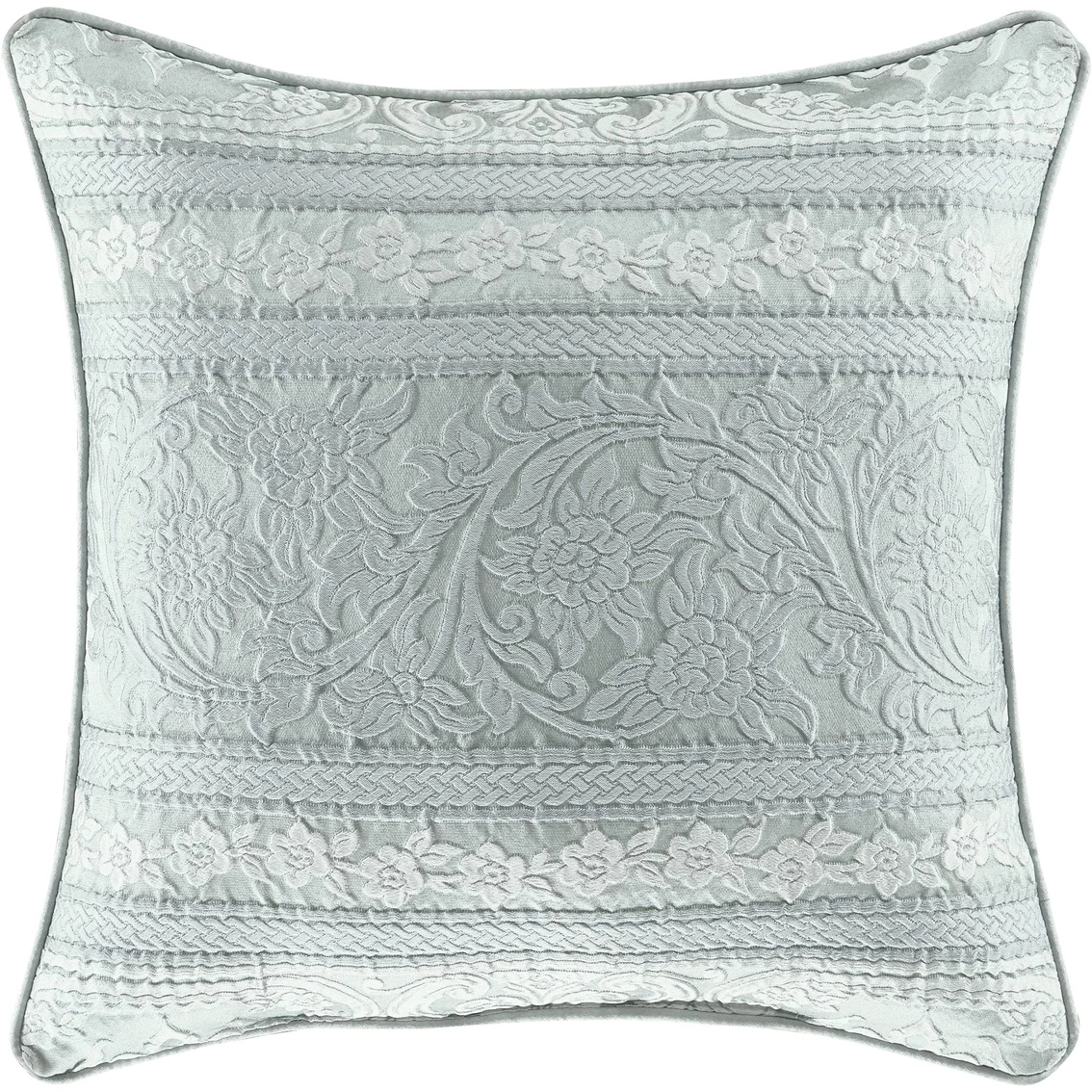The Riverside 20-in. Decorative Throw Pillow form J. Queen New York is exquisite with its use of spa blue hues. This beautiful square accent pillow features a horizontal decorative floral medallion stripe in a raised construction for texture, and reverses to a puff basket weave.
