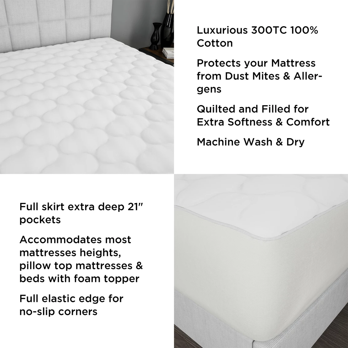- Soft and Quilted: The breathable 100% cotton, 300 thread count mattress cover is luxuriously soft and is quilted to keep the filling evenly distributed throughout the pad. It’s a cozy addition to your bed linens!