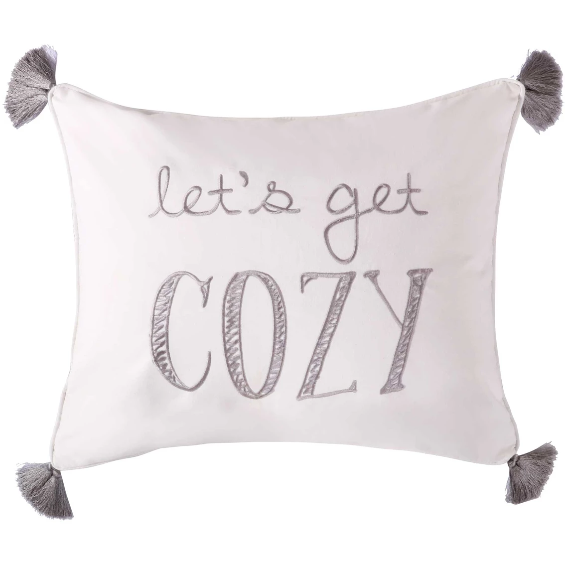 The Levtex Home Camden Let’s Get Cozy Tassel Pillow features an embroidered saying in grey on a white background, adding an inviting personal touch to your décor. This imported 16 in. x 20 in. pillow has a machine-washable shell, is made of 100% cotton and comes with a duck feather insert. Style: L17210P-A.