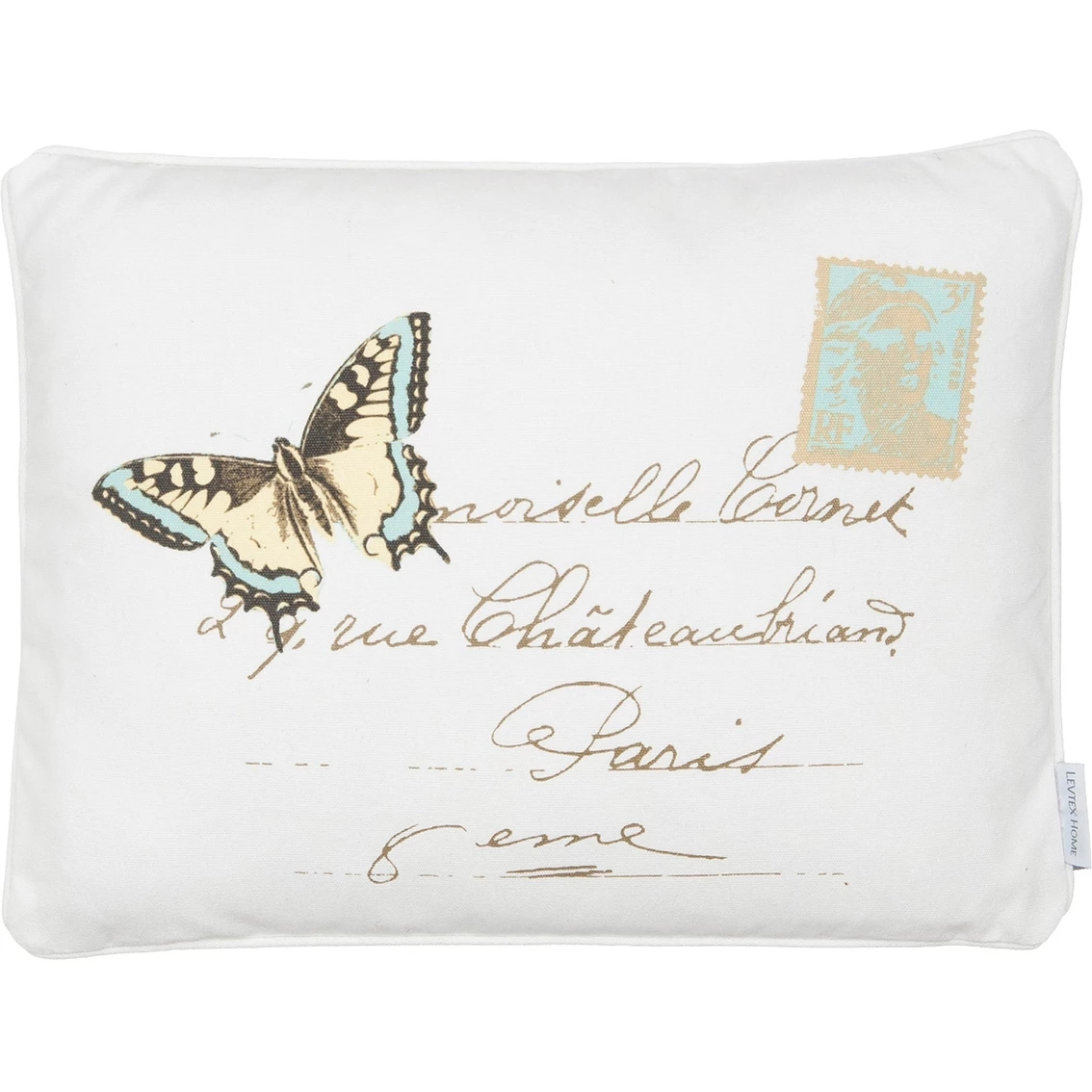This pillow features a cursive writing and a large butterfly printed with a vintage flair on a solid white canvas ground. Pillow includes feather insert. Model: L48601P-C.