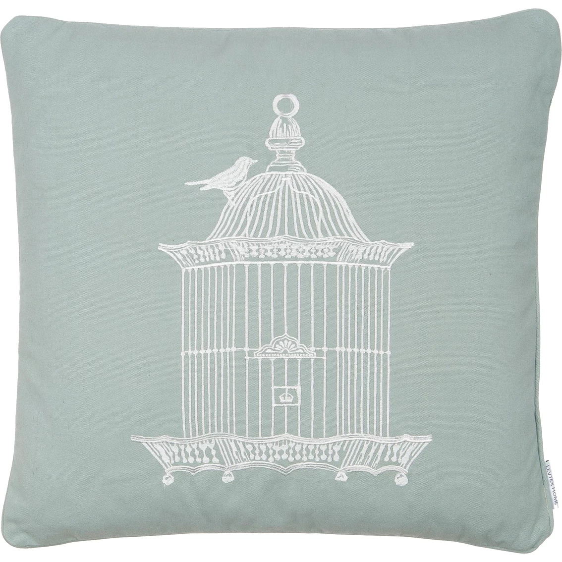 This pillow features a bird perched on an intricate birdcage embroidered in white on a soft, muted teal ground. Pillow includes feather insert. Model: L48601P-B.