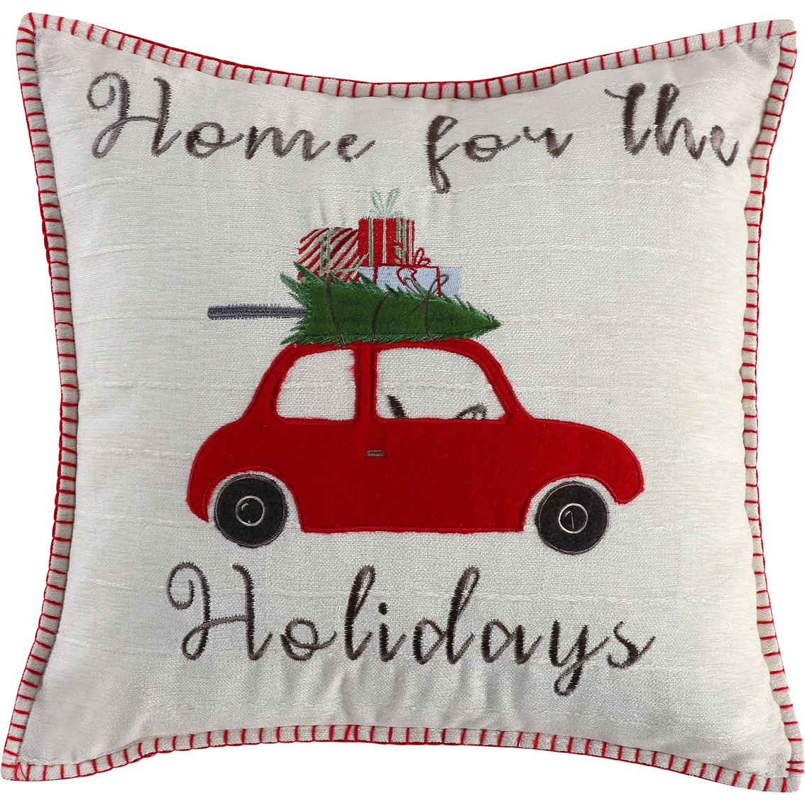 The Embroidered Home For The Holidays decorative pillow from Levtex Home matches perfectly with the Levtex Home Road Trip bedding collection. This pillow is sized at 18 x 18 in. and features an appliqued car with tree and gifts on top and a blanket stitch border.