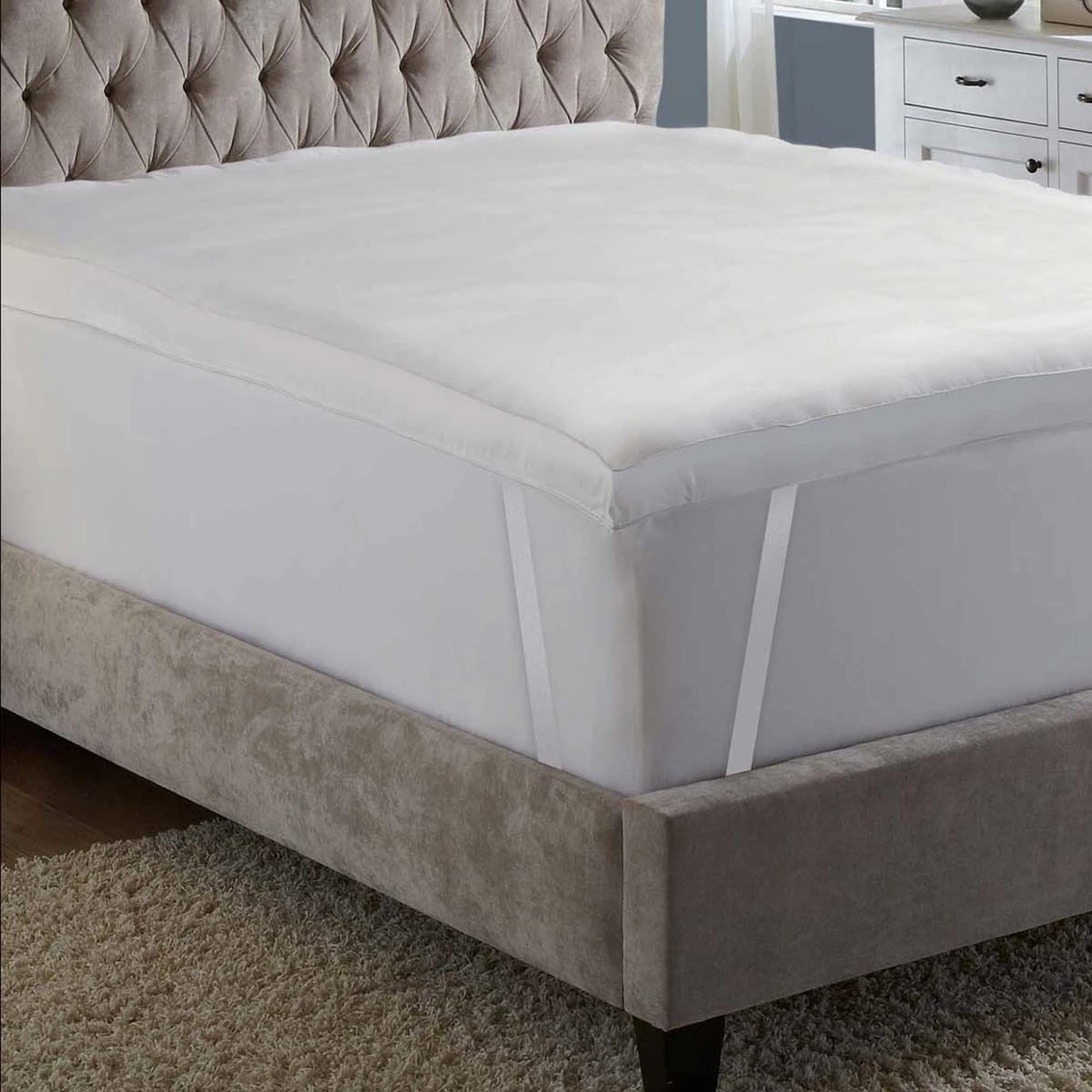 A great alternative to heavy blankets and over-filled duvets, this 5 in. featherbed can be placed right on top of your existing mattress and features a divinely soft layer filled with a 50/50 blend of 100% duck feathers and revolutionary puffball fiber for an extra layer of softness and support and an extra bit of warmth. A feather-proof liner helps to keep feathers inside without poking through. It is finished with a 100% cotton cover for a clean, classic look, 5 in. gusset and baffle box construction to keep filling from shifting. This featherbed delivers just the right amount of warmth, support, cushioning and unparalleled feather comfort. Spot clean only. Model: FB-020.