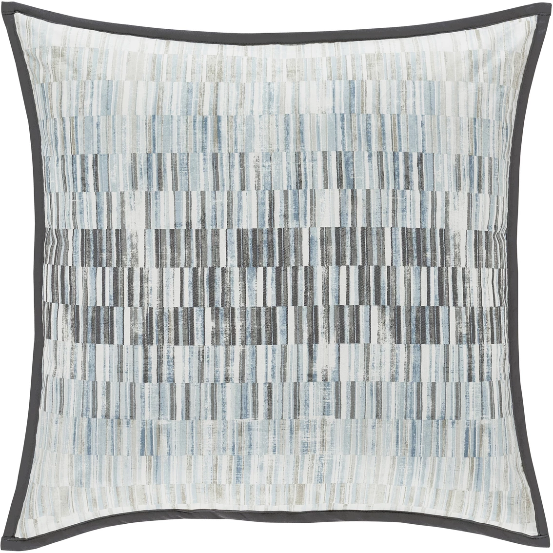 This 20-in. square pillow from Oscar Oliver is part of the Flatiron Modern Bedding Collection. It features a textured geometric print with a gradating mix of natural, earthy textures in neutral hues of tan, charcoal and soft blue. The pillow is completely reversible, with ultra-soft 100% brushed cotton on both sides, and finished with .25-in. grey cotton binding. Model: 239402620SQ.