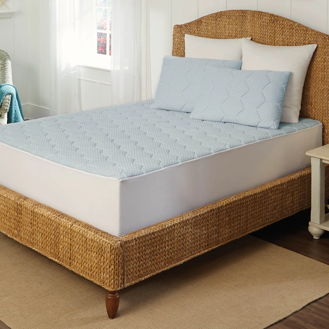 The Arctic Sleep by Pure Rest Cooling Gel Memory Foam Mattress Pad allows you to sleep cool while protecting your mattress at the same time. The Cooling Gel Memory Foam Mattress Pad is specially designed so that the top layer of the pad is made with cooling gel-infused memory foam which will help regulate the temperature of this mattress pad during your sleep while still providing the benefits of memory foam. The bottom layer contains a layer of soft, yet supportive, superior quality hypoallergenic polyester fiber for added comfort. Both layers are quilted together in a delightful and unique quilted pattern. As an added benefit, the cover is a contemporary knit cooling fabric and accented with blue thread with an integrated stretchy skirt to fit mattresses 18-22 in. deep. Easy care machine wash and dry. Style: MP-079.