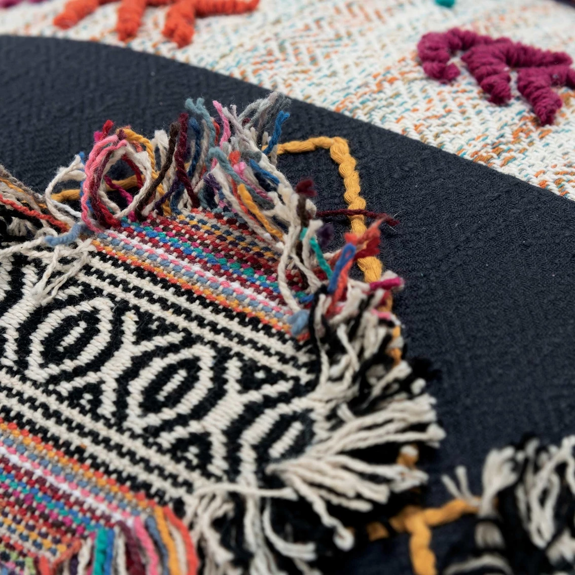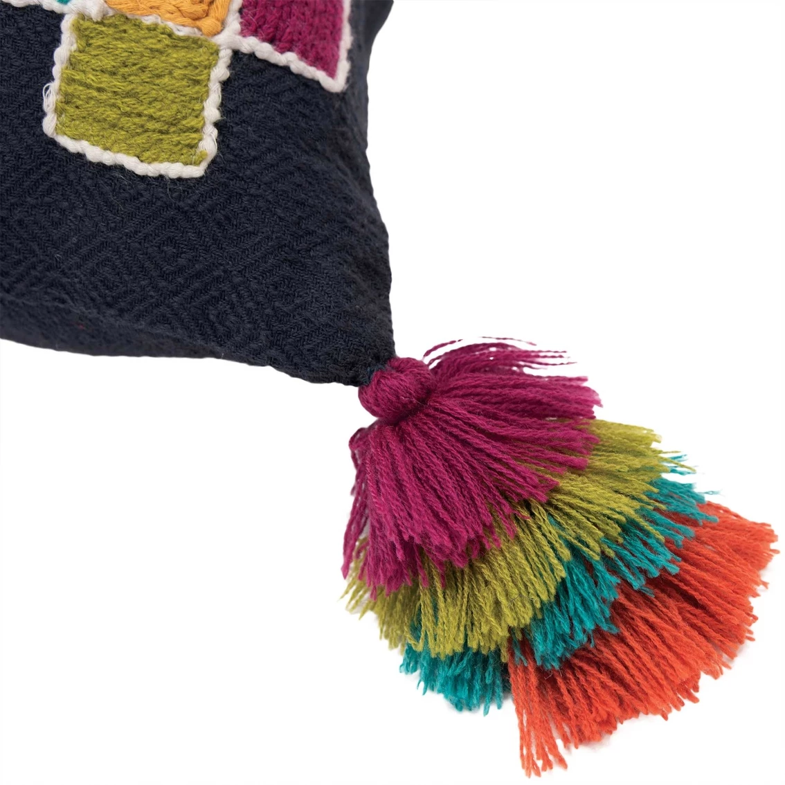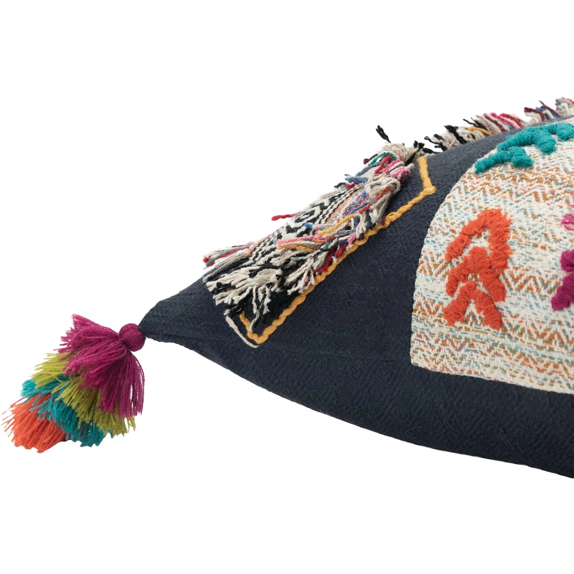 Two solid and one woven panel of fabric with ombreing color in a soft tribally influenced pattern are the foundation for this pillow from Rizzy Home. Woven tribal diamonds applied with fraying sides are grounded with yellow embroidered diamonds. Colorful arrows of embroidery mirror the subtle pattern in the central panel. Heavy textural embroidery and applied tassel accents complete the third panel. Knife edged, this pillow sports four corner tassels with four layers of the same rich color that is found through out the pillow. The back of this pillow is a coordinating solid cotton back featuring a hidden zipper closure for ease of fill.