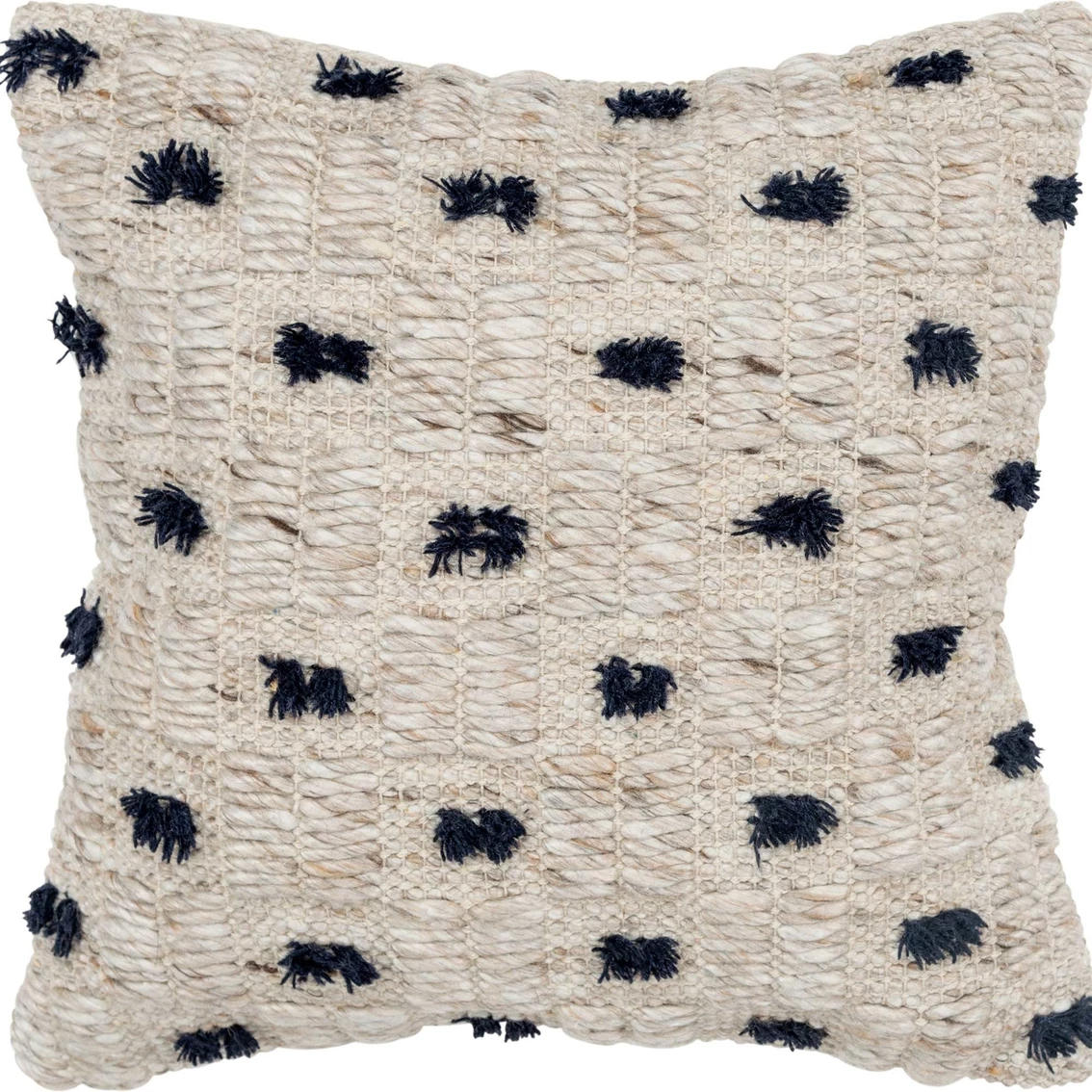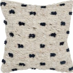 Woven of natural and neutrally blended shades of yarn, this Rizzy Home decorative throw pillow features a woven texture with tufted accents in black yarns with longer eyelash and textural influence. This square pillow exudes a strong modern industrial and modern craft vibe. Knife edged design with solid coordinating back. Hidden zipper closure. Polyester fill. Size: 20 x 20 inches. Style: PILT15782NT002020.