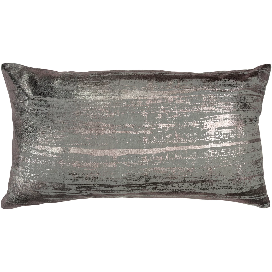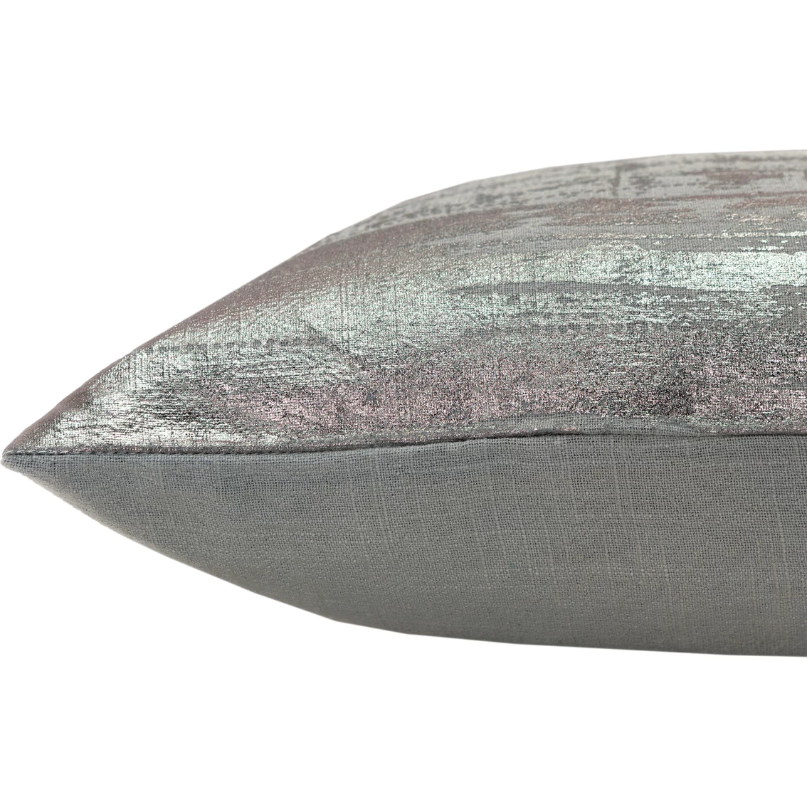This Rizzy Home pillow features a horizontal dry brush stroke pattern in silver foil print. The silver cotton slub on which this pattern is printed gives it a slightly nubby texture yielding a slightly distress printed appearance. Knife edged, this pillow features a coordinating solid back with a hidden zipper closure for ease of fill. Style: PILT16561GY001426.