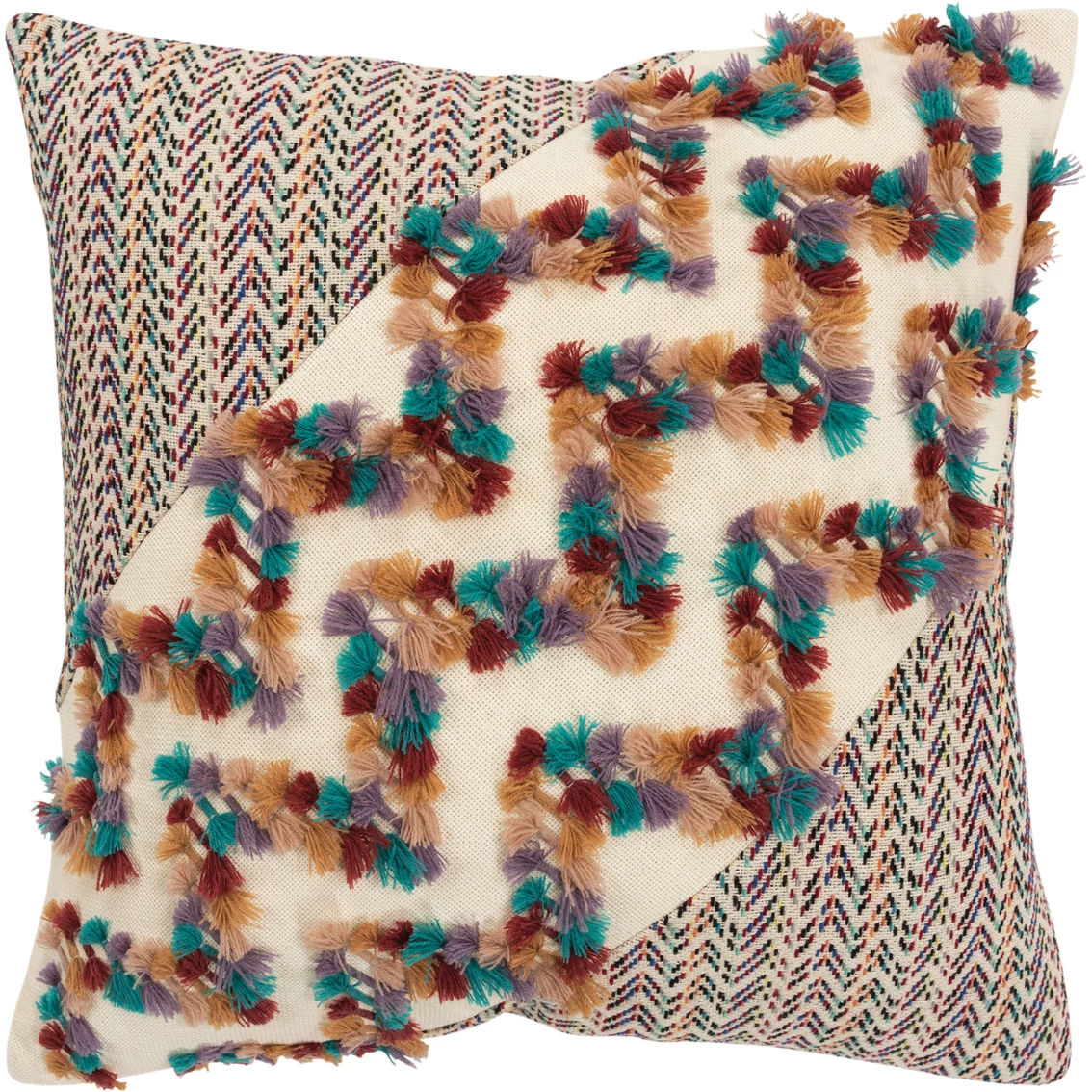 Woven color and texture and exploded color-laced patterning across the center diagonal panel is the focus of this pattern. This pillow from Rizzy Home is a study in weaving and exploding that weaving in the center panel using a more dramatic method. Knife edged, this pillow features a coordinating solid back with a hidden zipper closure for ease of fill. The pillow measures 20 in. x 20 in. and has a polyester fill. Model: PILT16246MU002020.
