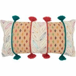 This delightful collage of fabric woven textures and applique with embroidered accents makes this pillow a collage of craft. Twisted cord accents with tassel ends add whimsy and sass to this pillow from Rizzy Home. Color is bountiful, and this pillow’s playfulness makes it at home in many living spaces. This knife-edged pillow’s solid coordinating back features a hidden zipper closure for ease of fill and cleaning. The pillow has a polyester fill. Model: PILT15906MU001426.