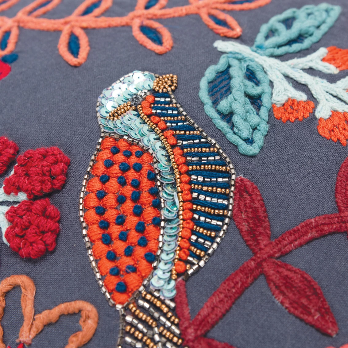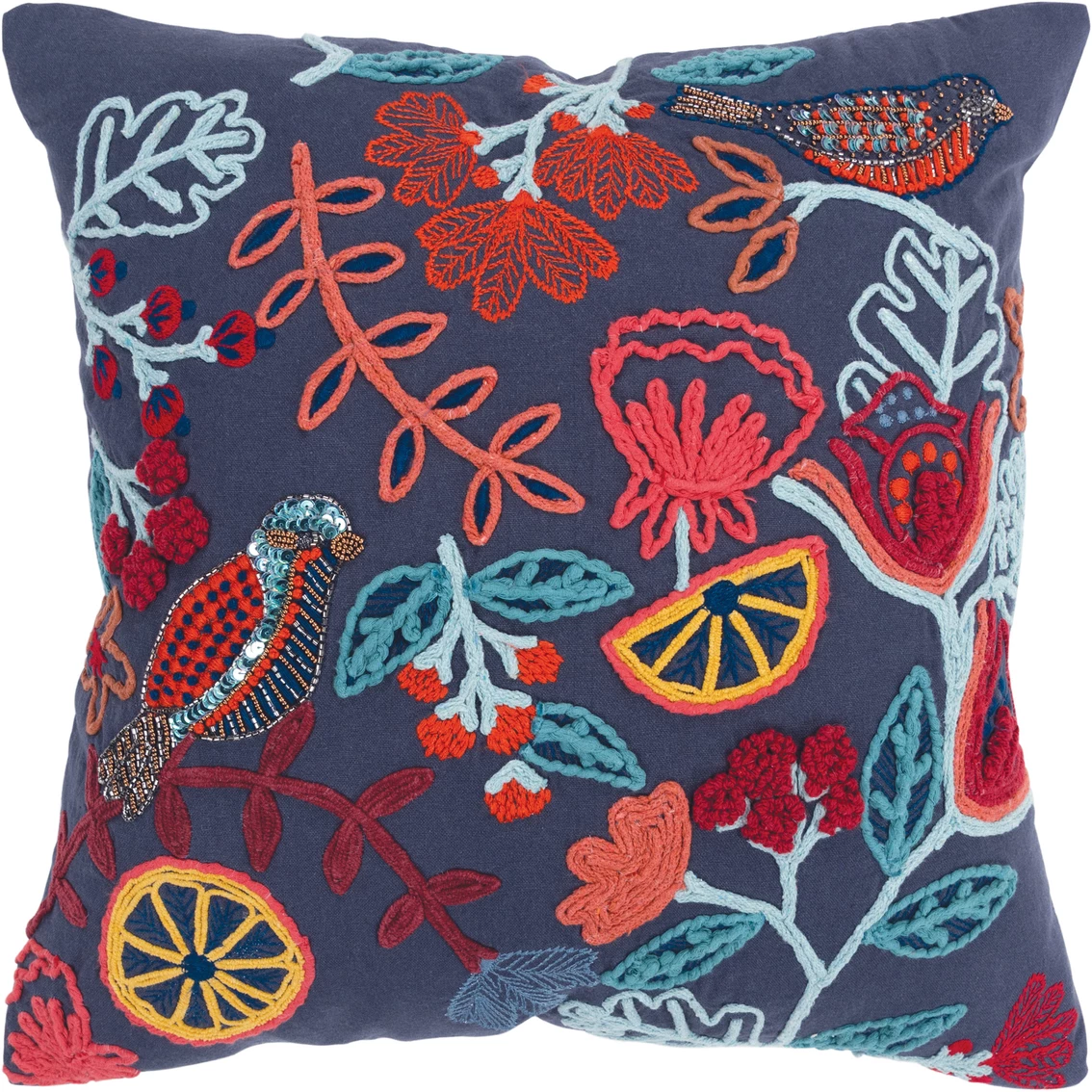 Add charm to your home decor with this Rizzy Home decorative throw pillow. Heavily stitched embroidery in a variety of stitching techniques. Traditionally Jacobean inspired bloom shapes make this square throw pillow artisanally crafted. Bright colors against the dark blue background showcase a classic study in vintage stitchery. Hand beading and hand sequencing details on the birds bring the beauty of handcrafted detailing to this pillow. Coordinating solid back. Hidden zipper closure. Polyester fill. Size: 20 x 20 inches. Style: PILT16224MU002020.