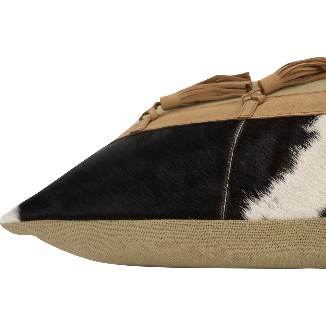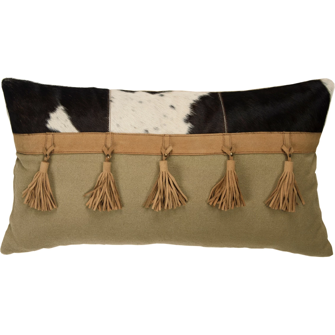 This hair-on-hide leather color blocked pillow features coordianting banding from which five tassels are suspended and rest against a wonderfully recycled cotton. This pillow embodies the relaxed leegance and style of YOUR modern day farm/ranch/wherever you hang YOUR hat. Knife edged, this pillow features a solid cotton back with a hidden zipper closure for ease of fill. Model: PILT15399NT001426.