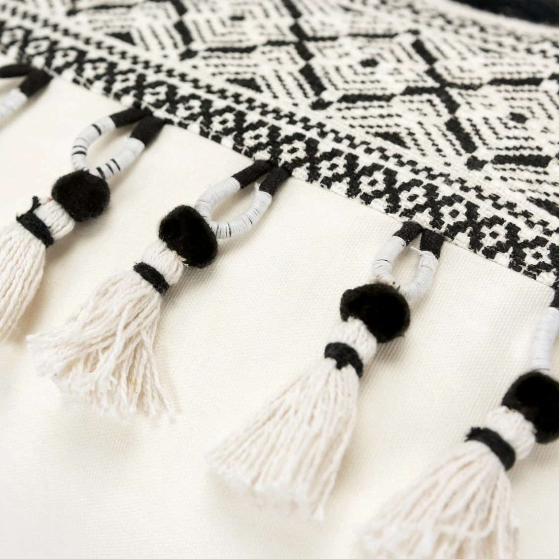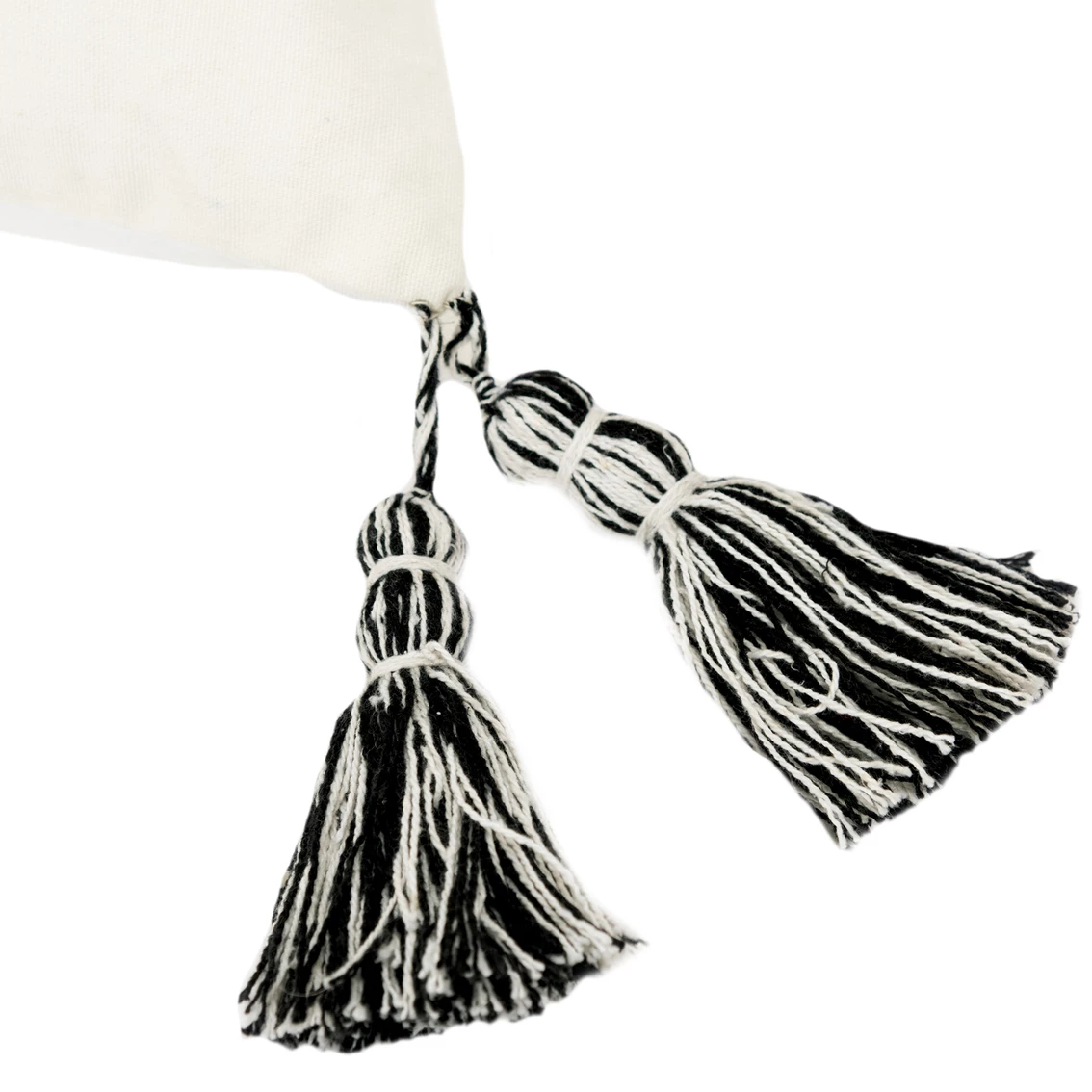 Woven tribally inspired pattern in black and ivory color blocked with solid ivory serves as the base for this pillow from Rizzy Home. Black loops with white embroidery overlay and black and white tassels suspended from them give the front bottom panel a lovely dimensional and fun detail. Multiple black yarns, braided and applied to the top panel of this pillow give it a rich textural and crafted appeal. Double corner swing tassels repeat the black and white details and hang from each of the four corners. This pillow has a solid coordinating cotton back with a hidden zipper closure for ease of fill.