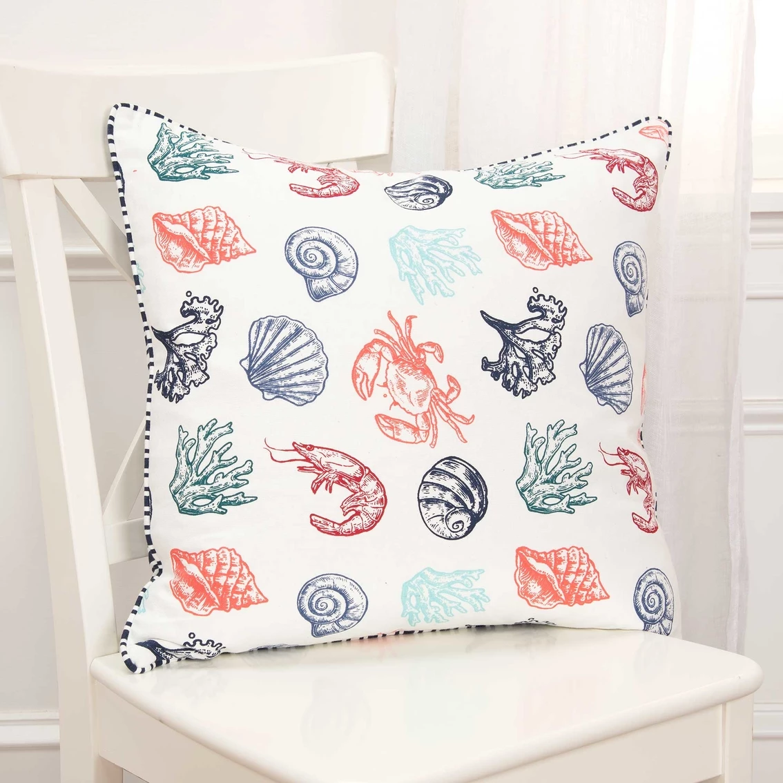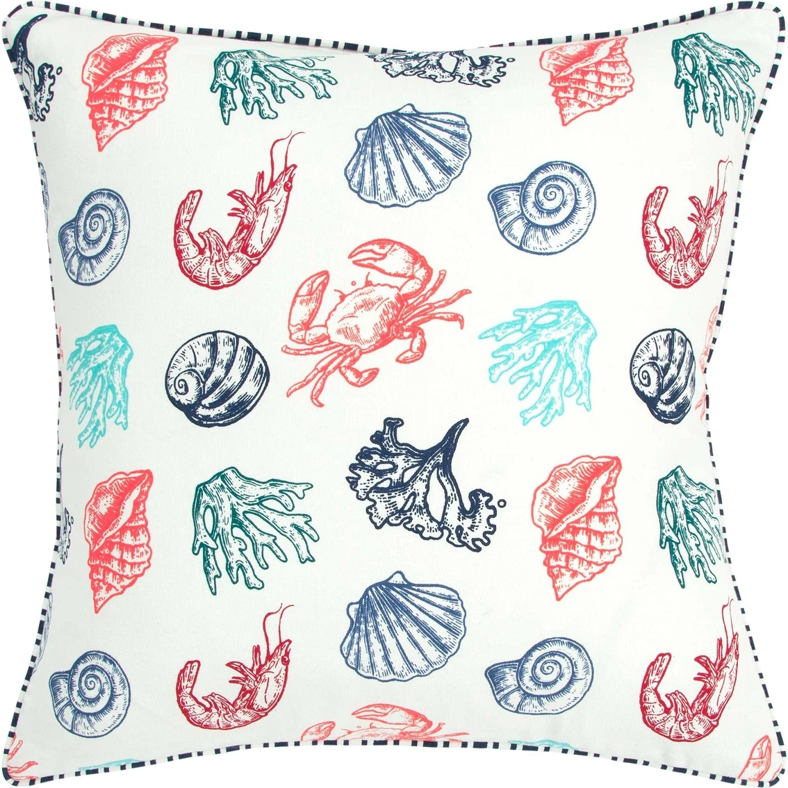 This whimsical Rizzy Home Sea life Coral throw pillow features a menagerie of sea creatures printed on a soft white background. The back is an indigo and soft white stripe with overlapping and ties in the center back. The welt of this decorative pillow is from that same striped fabric. The tie area of the back is THE opening of the pillow and functional in that the cover can be removed for cleaning or for fill changing through that concealed opening. Polyester fill. Size: 20 x 20 inches. Style: PILT15638MU002020.