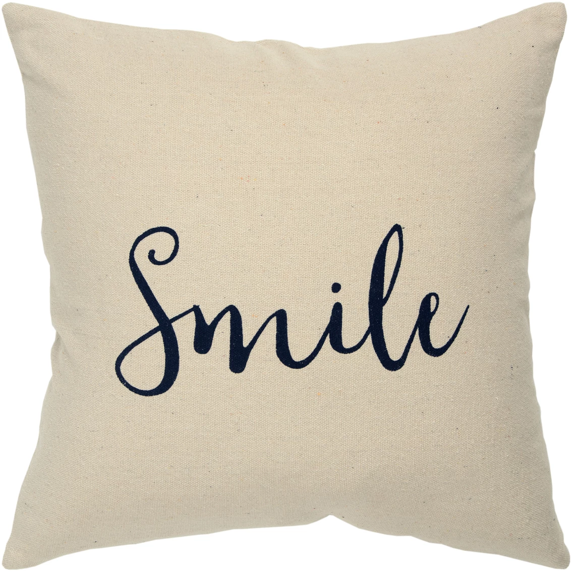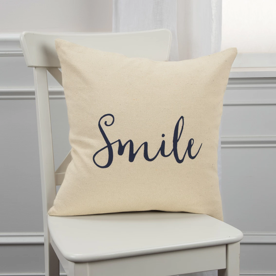 This whimsical font encourages us to SMILE. Inspired by skin art, this pillow is part of the “inked” collection. Printed on recycled cotton canvas, this pillow has a light texture. The back is solid but the same as the front. Knife edged, this pillow features a back hidden zipper closure for ease of fill. Model: PILT15871NT002020.