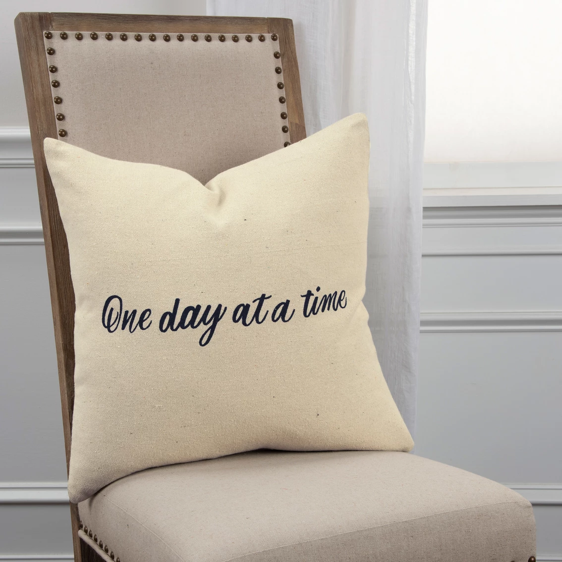 This whimsical font encourages us to take “one day at a time.” Inspired by skin art, this pillow is part of the “inked” collection. Printed on recycled cotton canvas, this pillow has a light texture. Knife edged, it has a solid matching back with a hidden zipper closure for ease of fill. Model: PILT15875NT002020.
