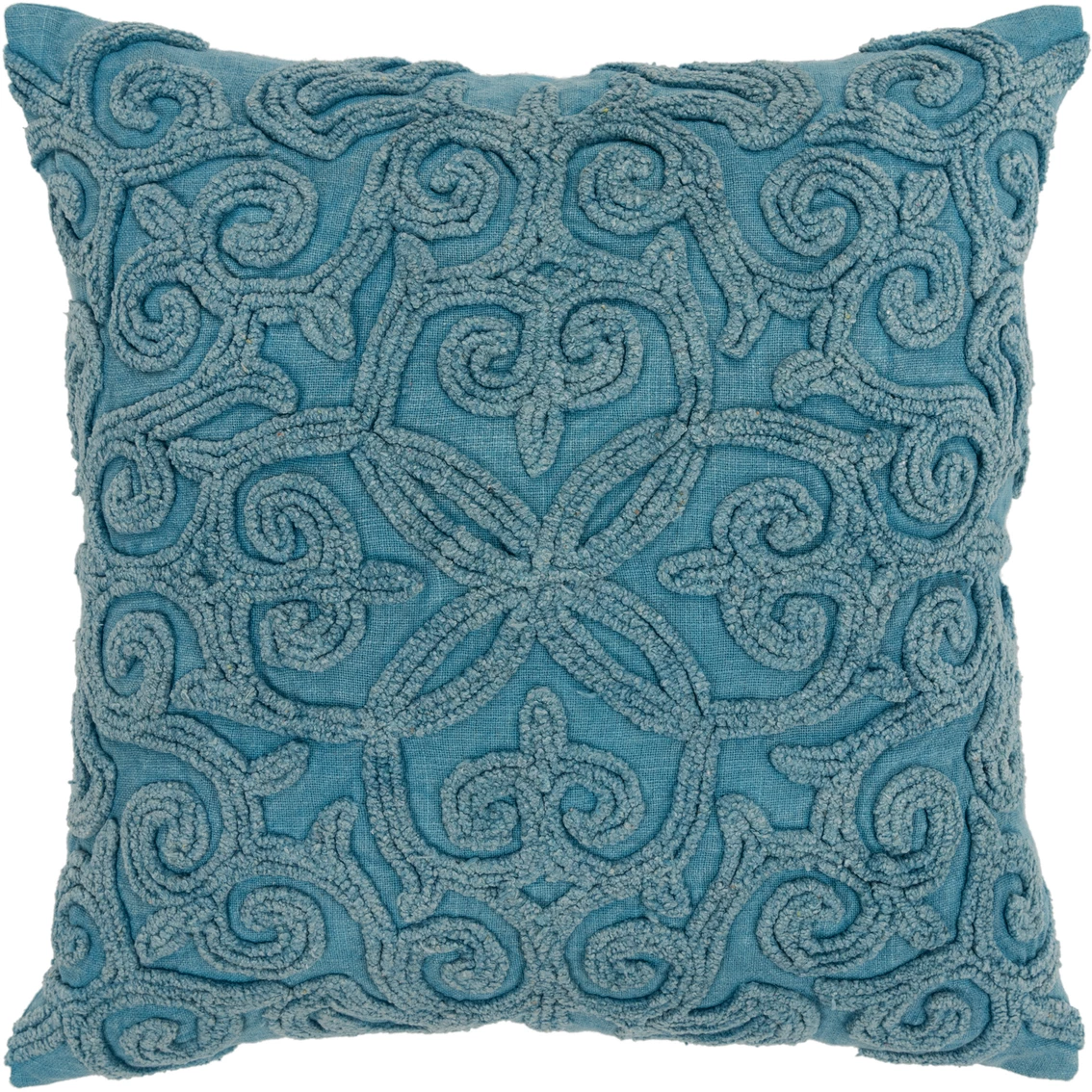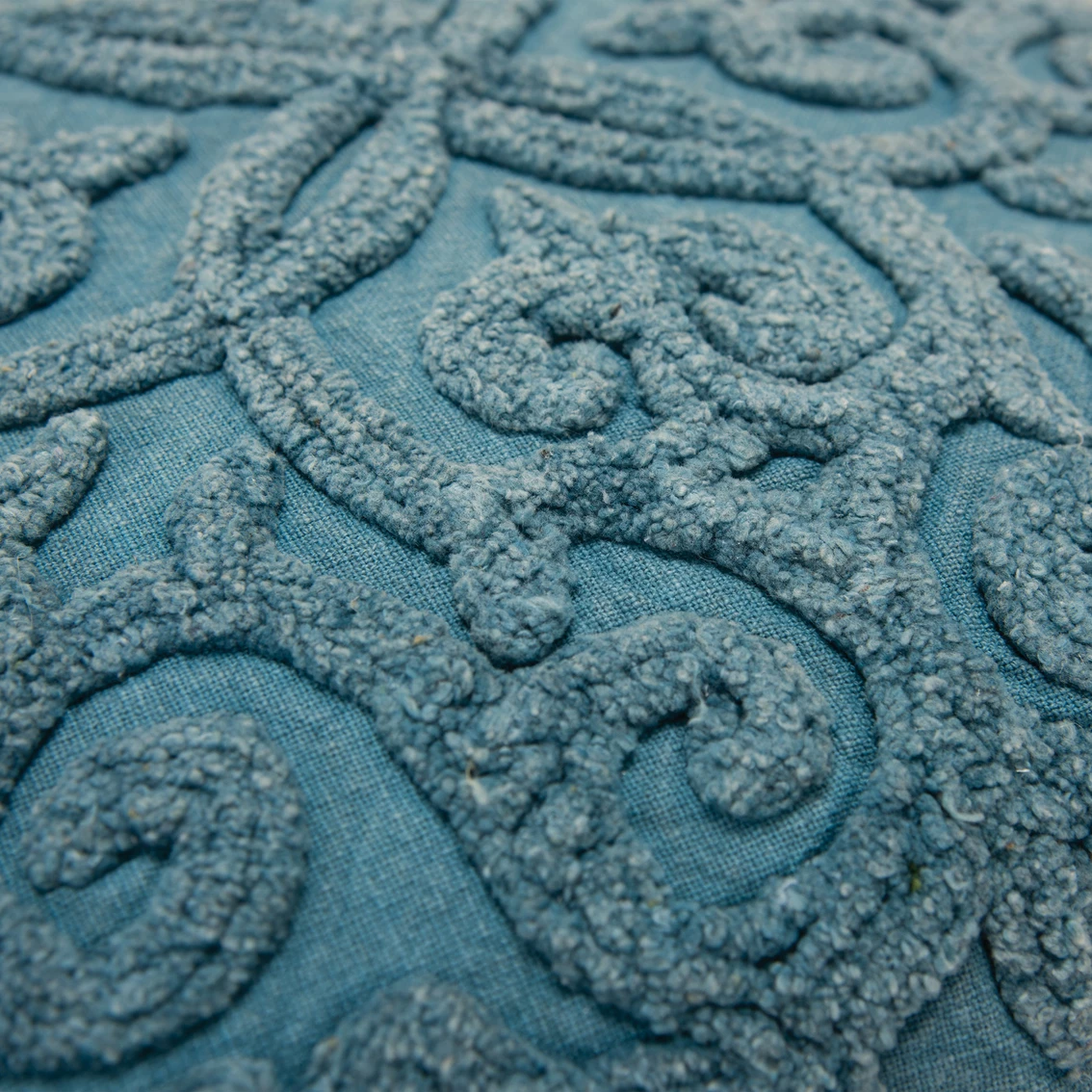 This richly textural Rizzy Home decorative throw pillow features heavy channel embroidery that is hand clipped after stitching to create a chenille appearance in this fleur-de-lis pattern. Embroidered onto a cotton canvas, this background also features a light texture. Stone washing gives this pattern a soft color wash and a vintage appeal. Knife edged pillow with solid coordinating back. Hidden zipper closure. Polyester fill. Size: 20 x 20 inches. Style: PILT16444LB002020.