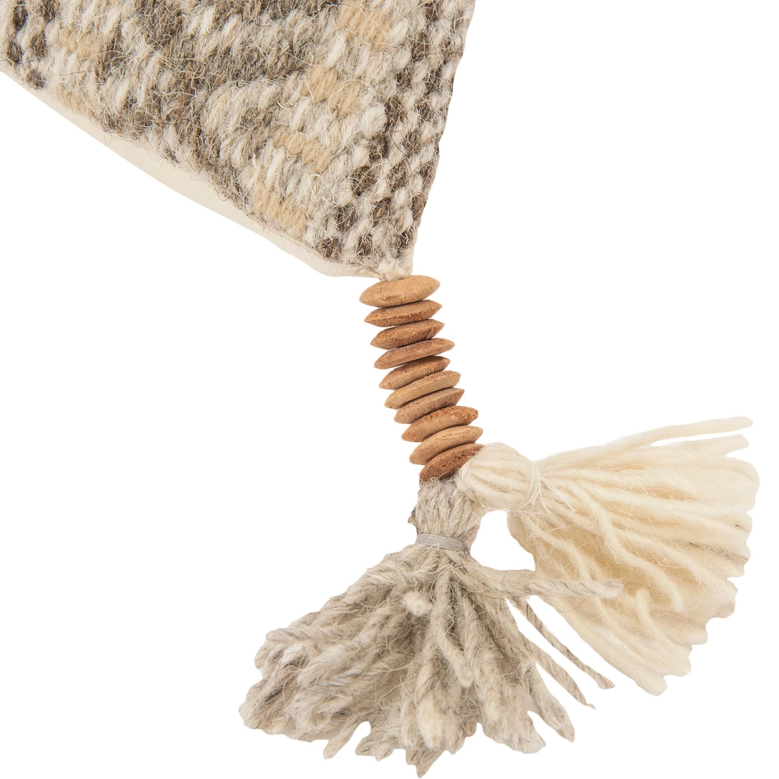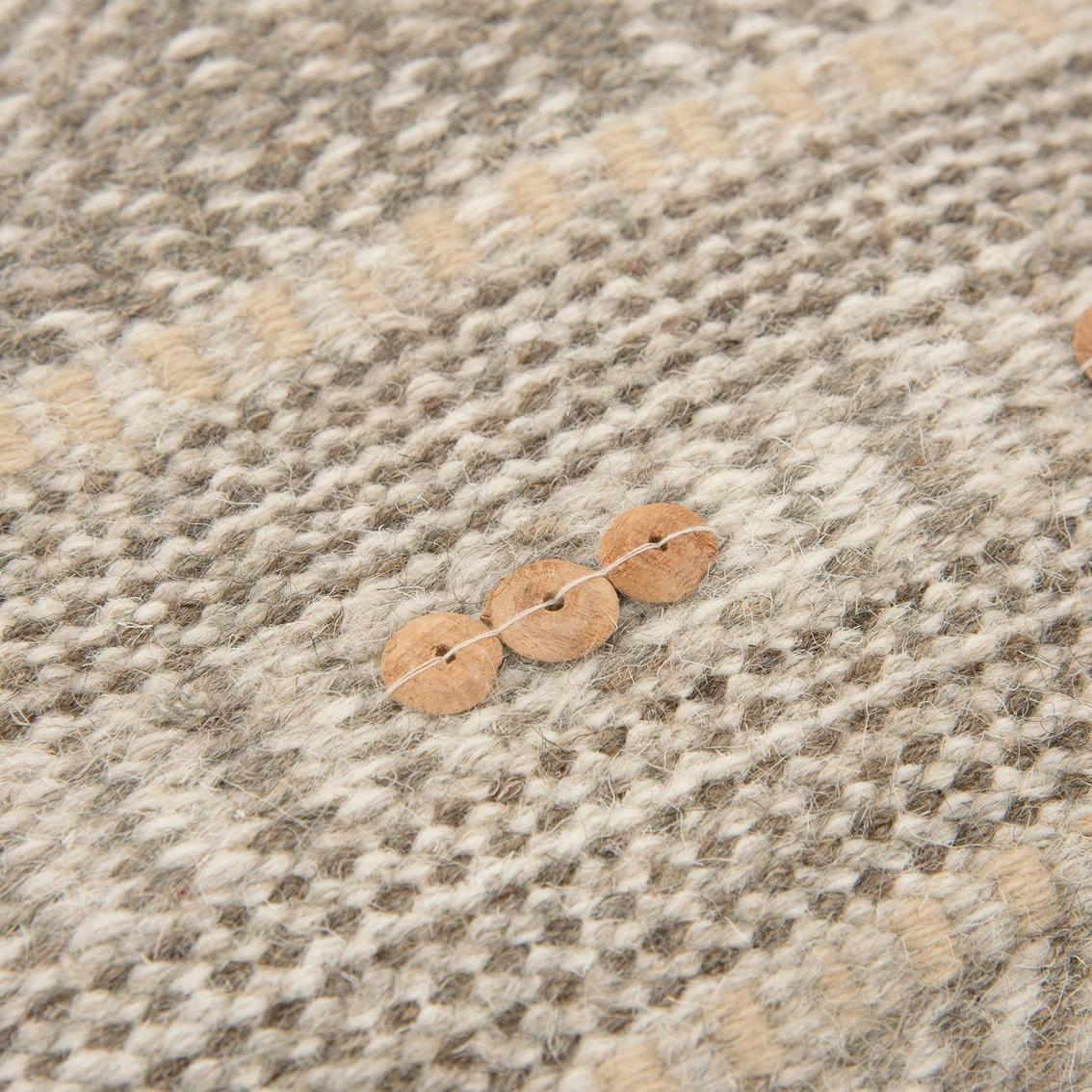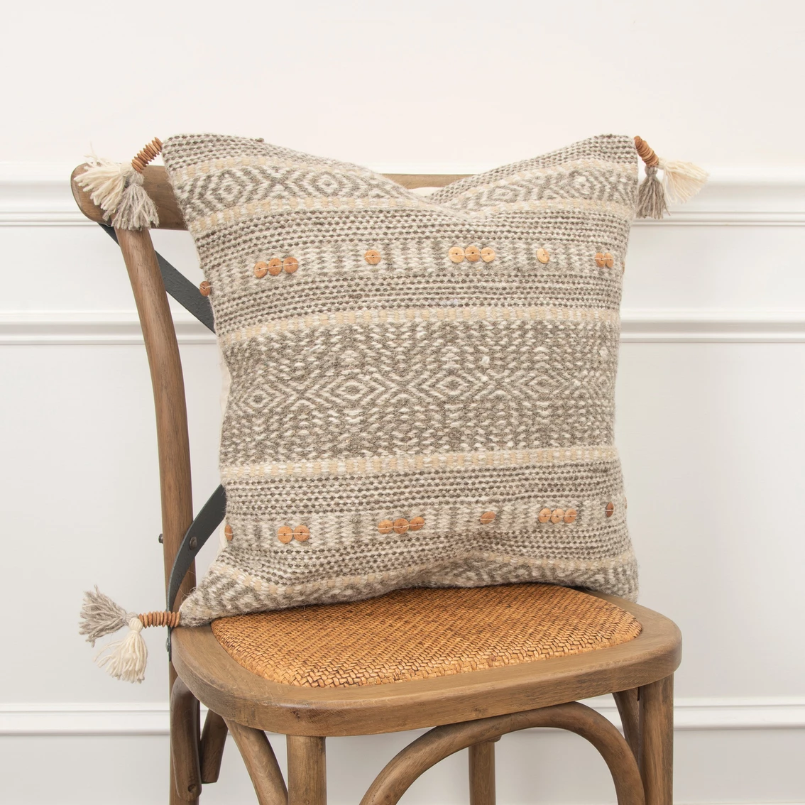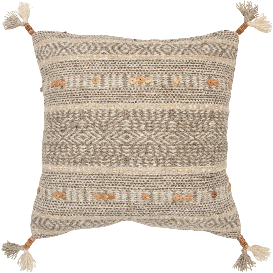 This pillow from Rizzy Home features color block styled differentiation for the textures featured in it. Wooden buttons embellish contrasting textural bands. Size: 20 in. x 20 in.