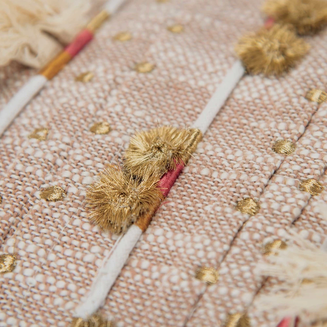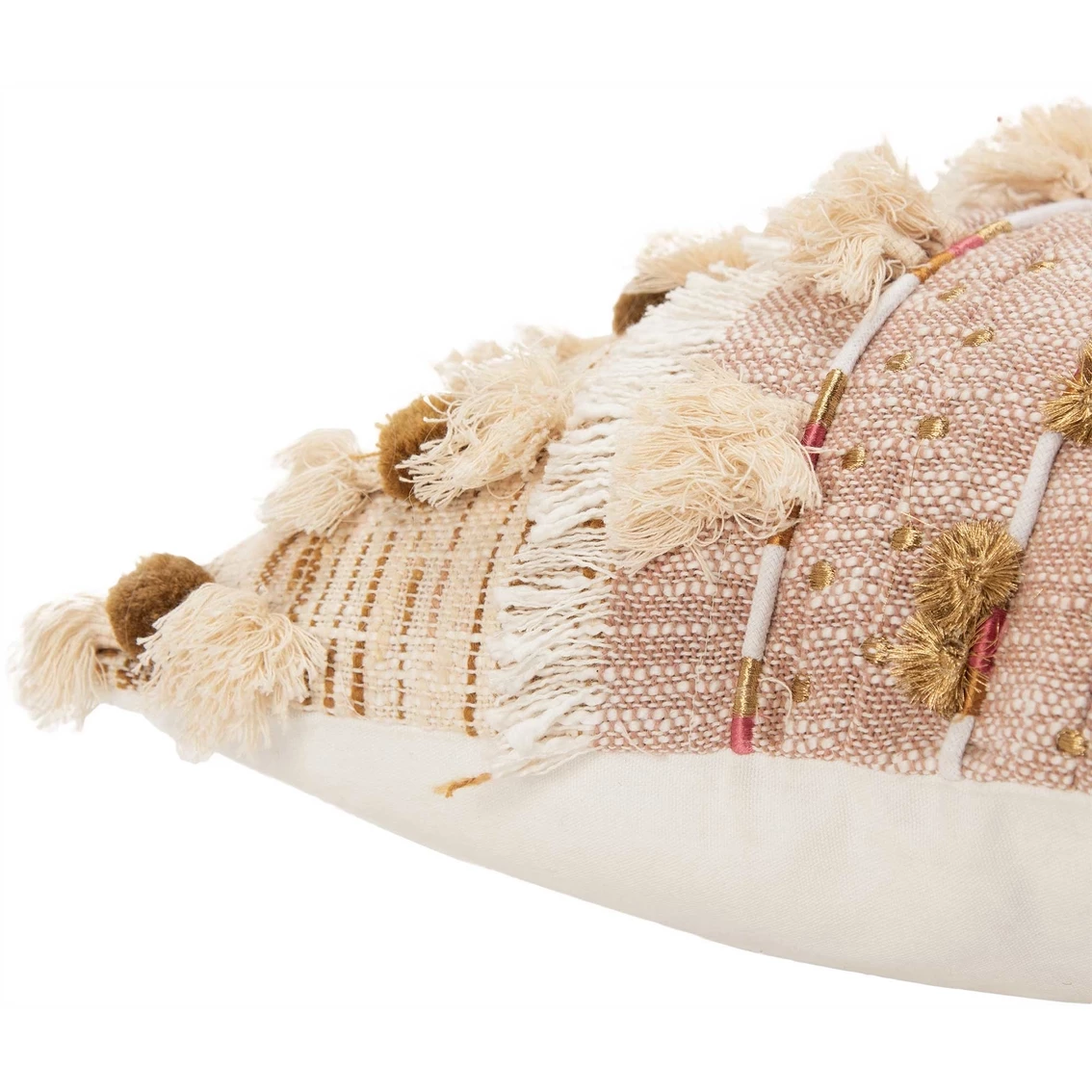 How many textures and tactile inspirations can one pillow offer? Well, this one from Rizzy Home is a perfect example of the perfect collaboration between visual and tactile expression. From woven panels of fabric – collaged with frayed edges exposed and hand kantha stitching anchoring them to applied tassel and pom accents, this pillow offers a panapoly of creativity and use of media. Knife edged, this pillow also features a coordinating solid cotton back with a hidden zipper closure for ease of fill.