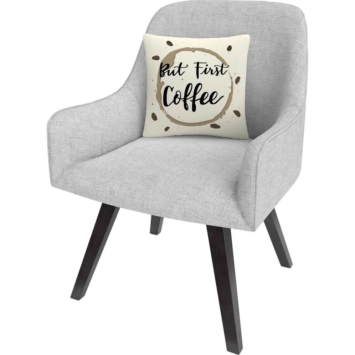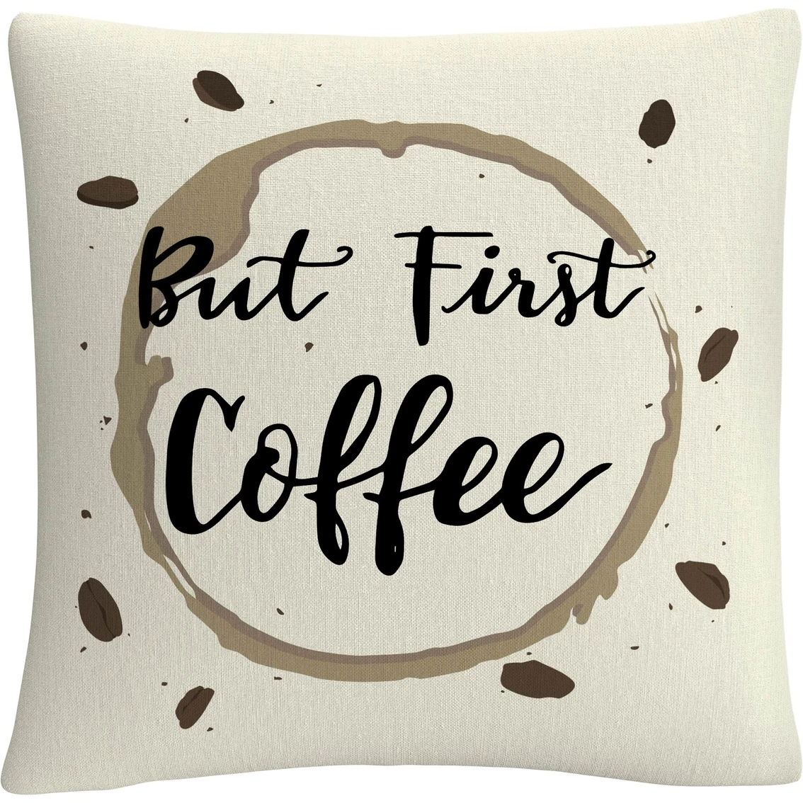 This decorative throw pillow from Trademark Fine Art brings creative comfort and style to any decor in your home or office and will lend any room an aesthetic edge that everyone will notice. It features the phrase “But First Coffee” inside a coffee stain ring. This chic and unique pillow features a full color printed cover over a 100% American-made polyester pillow insert. The 16 in. x 16 in. square shape is perfect as a decorative accent on a bed, a statement piece on your favorite armchair or mixed and matched as your own curated collection on a couch or loveseat. Made in USA. Style: ABC0001-PIL1616.