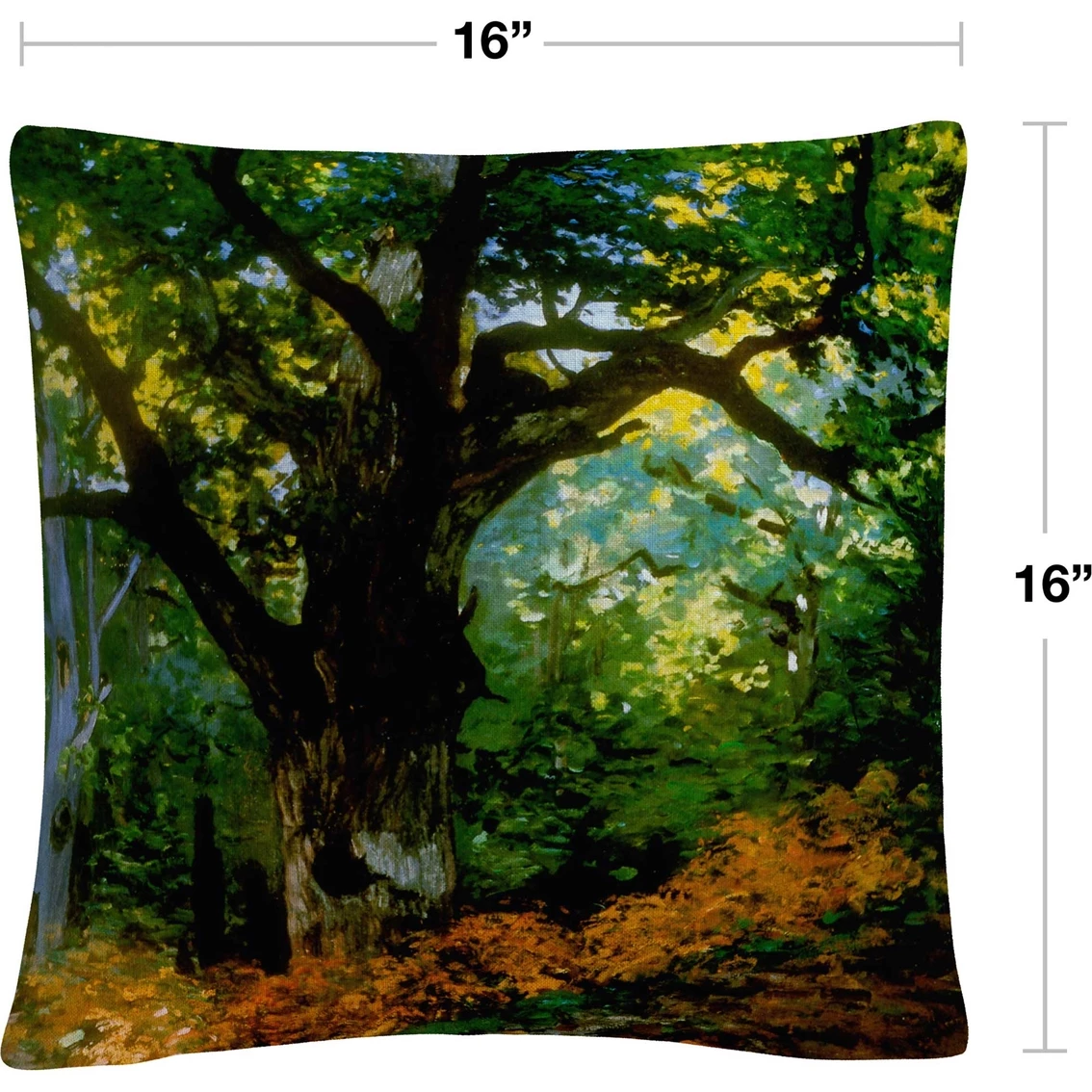 This decorative throw pillow features Bodmer Oak. Claude Monet was a founder of French impressionist painting, and the most consistent and prolific practitioner of the movement’s philosophy of expressing one’s perceptions before nature, especially as applied to plein-air landscape painting. Whether it’s your favorite classical art masterpiece or a fun, motivational phrase, Trademark Fine Art’s decorative throw pillows bring creative comfort and style to any decor in your home or office. These chic and unique pillows feature a full color printed cover over a 100% American-made polyester pillow insert. The 16 x 16 in. square shape is perfect as a decorative accent on a bed, a statement piece on your favorite armchair, or mixed and matched as your own curated collection on a couch or loveseat. With a variety of high-quality images, one or more of Trademark Fine Art’s carefully crafted pillows will lend any room an aesthetic edge that everyone will notice. Size: 16 x 16 in. Model: M0002.