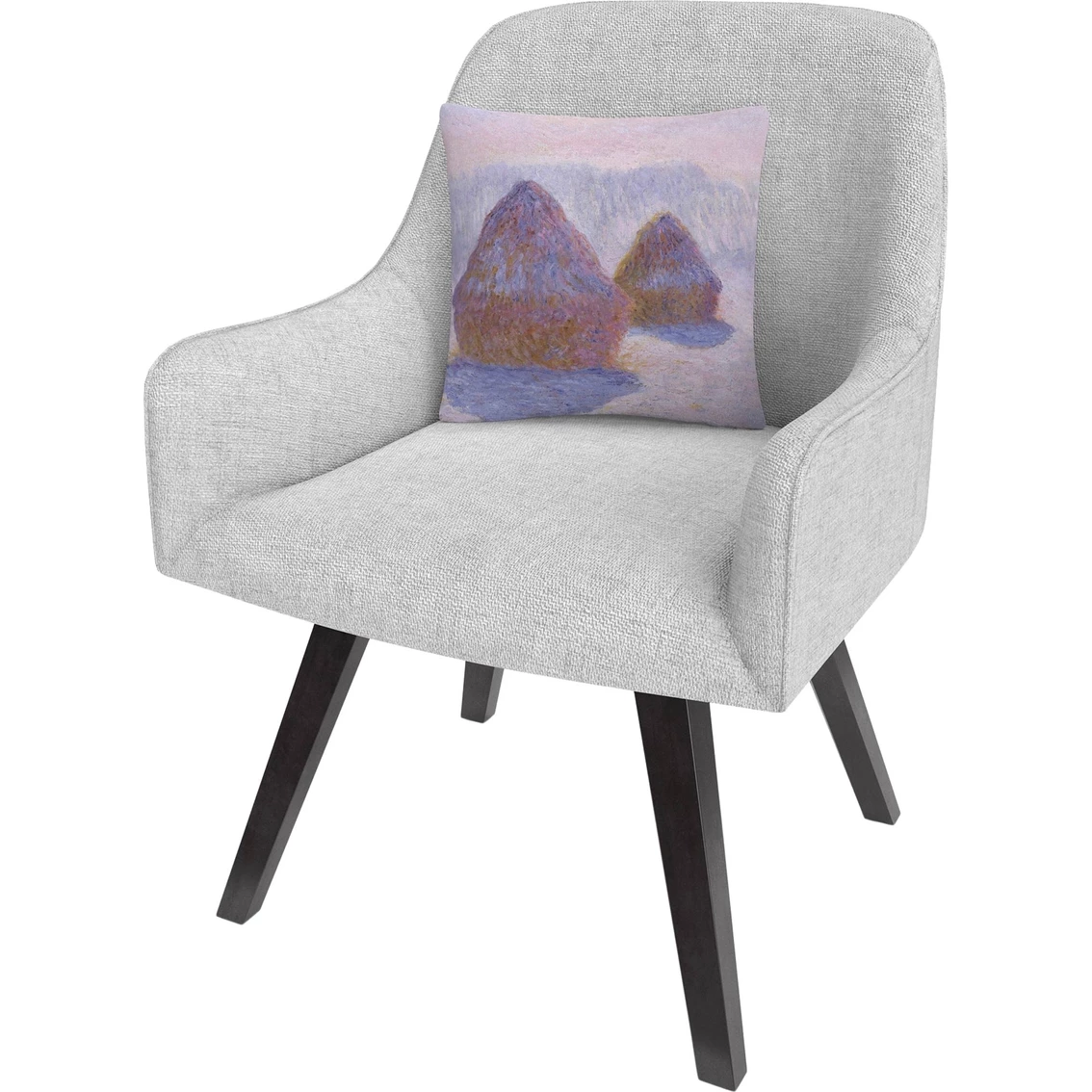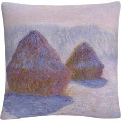 This decorative throw pillow features a landscape with piles of hay in the center.