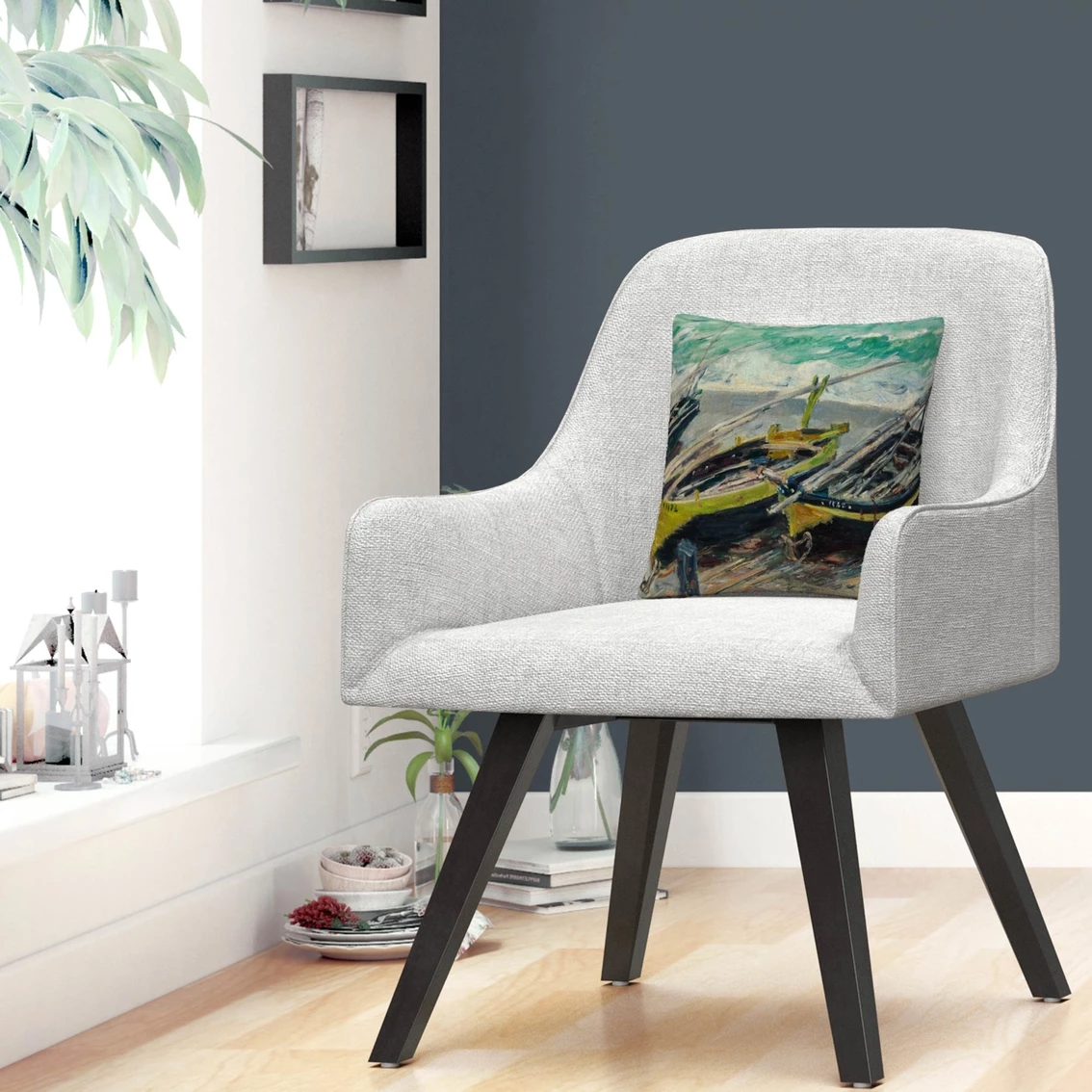 This decorative throw pillow features three boats sitting on a beach next to the water.