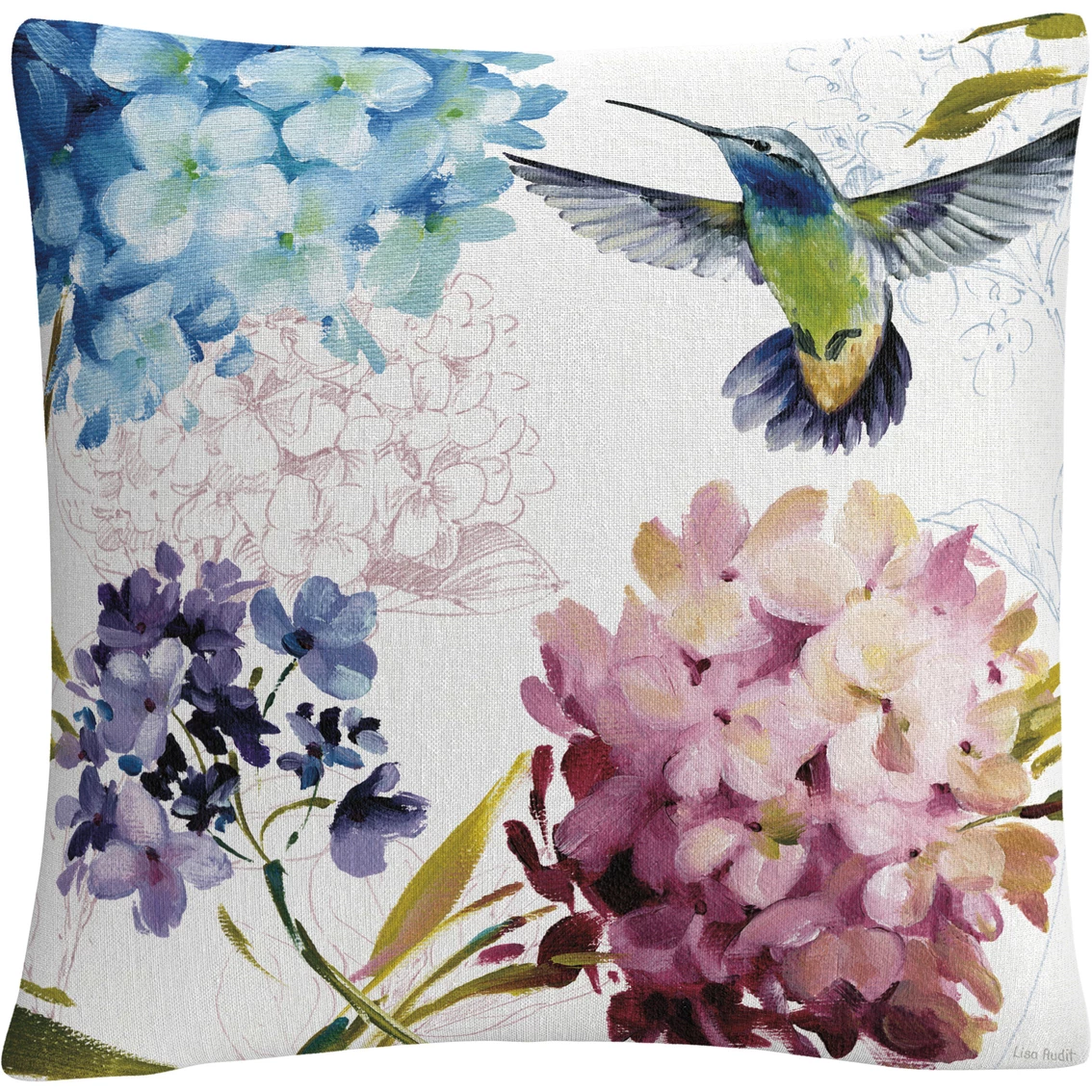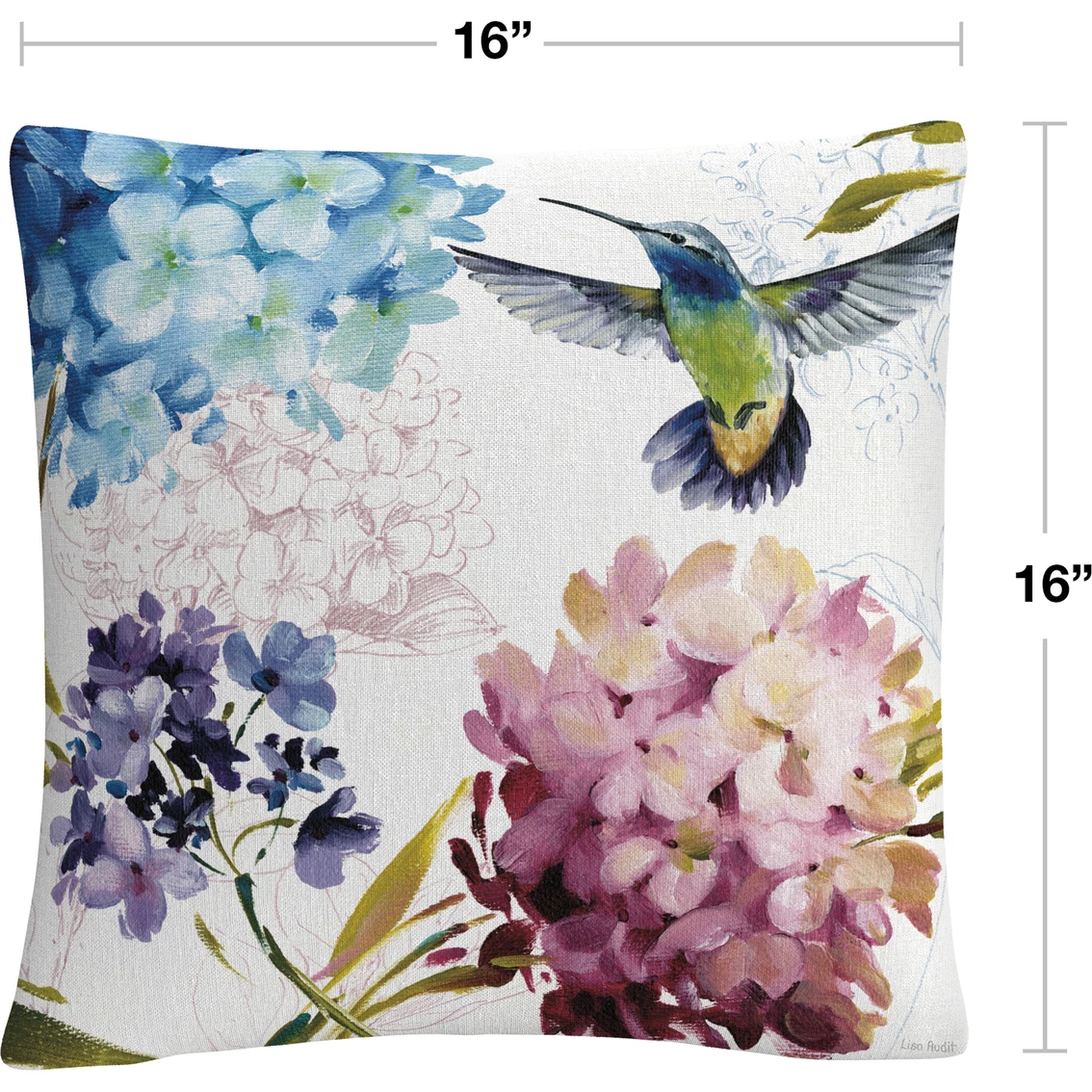 This decorative throw pillow from Trademark Fine Art features a floral design with a hummingbird by artist Lisa Audit in a contemporary style.