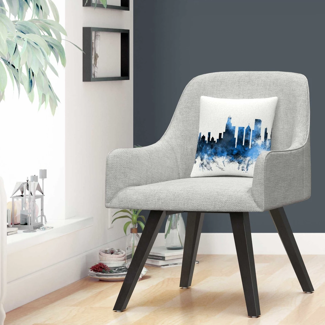 This decorative throw pillow features a blue watercolor skyline of Chicago, Illinois.