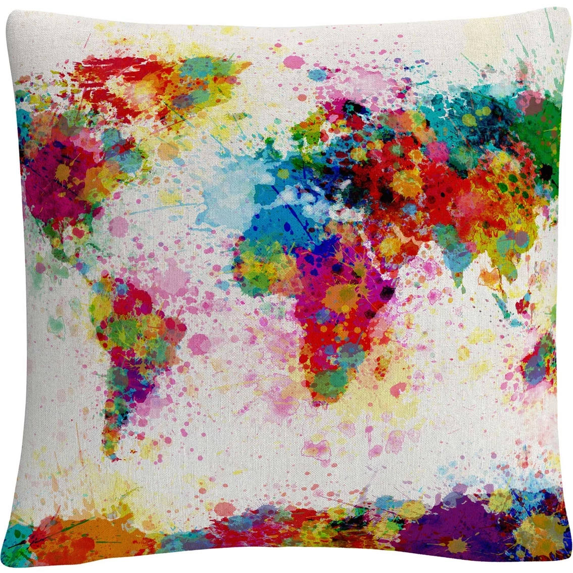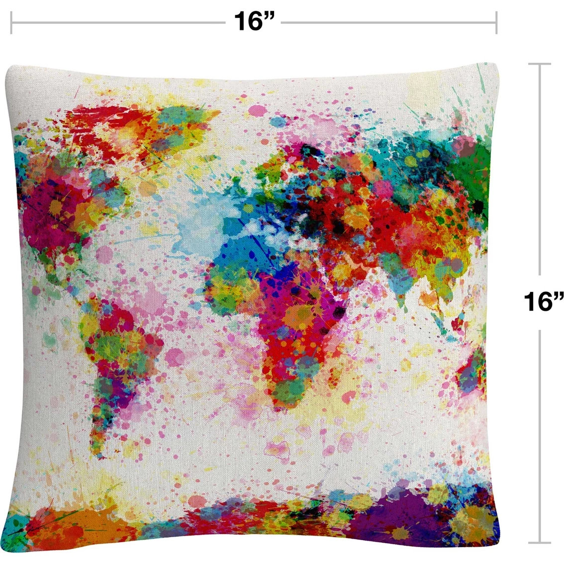This chic and unique decorative throw pillow from Trademark Fine Art features a world map made from colorful paint splatters by artist Michael Tompsett. Pillow includes a full-color printed cover over a 100% American-made polyester pillow insert. The 16 x 16 in. square shape is perfect as a decorative accent on a bed, a statement piece on your favorite armchair or mixed and matched as your own curated collection on a couch or loveseat.