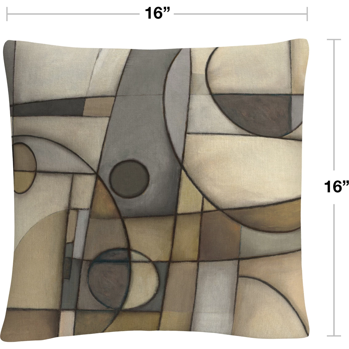 Trademark Fine Art Mike Schick Mythology Neutral Decorative Throw Pillow is a 16 in. x 16 in. decorative throw pillow that features thin black lines forming blocks and circles of brown, tan, grey, and white. These chic and unique pillows feature a full color printed cover over a 100% American-made polyester pillow insert. Perfect as a decorative accent on a bed, a statement piece on your favorite armchair, or mixed and matched as your own curated collection on a couch or loveseat. Model: WAP03272-PIL1616.