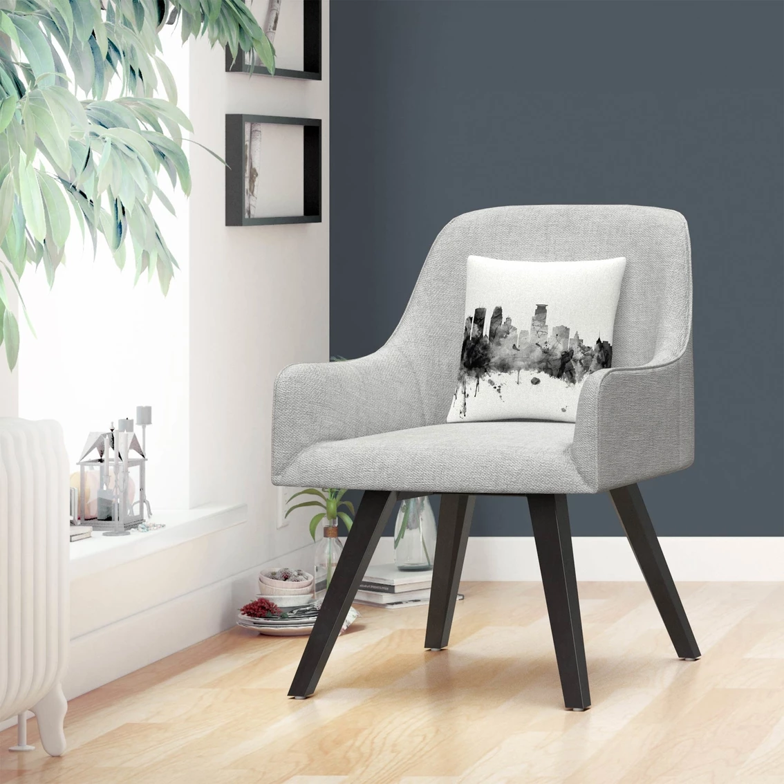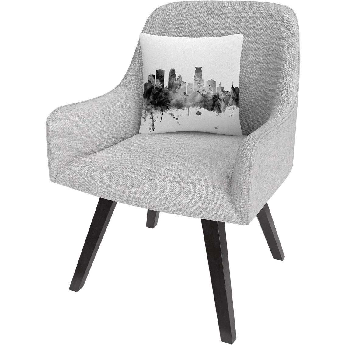 This decorative throw pillow features a watercolor skyline of Minneapolis, Minnesota.