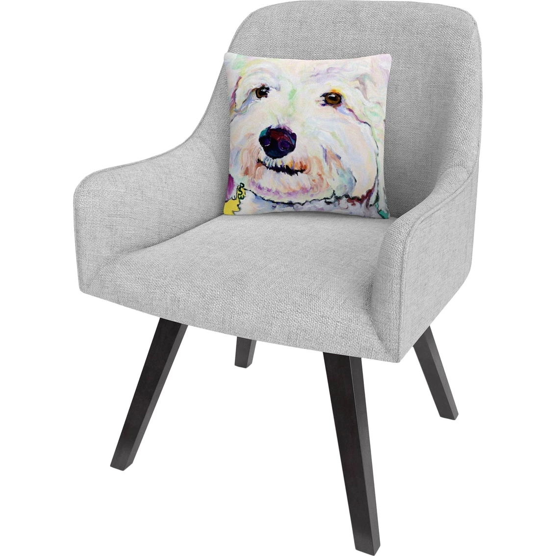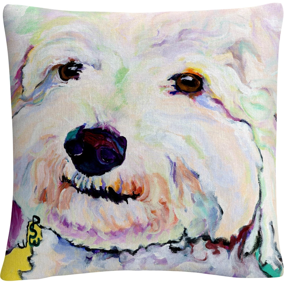 This decorative throw pillow features a white dog. Instantly recognizable are the brilliant, saturated colors of Pat Saunders’ paintings. Pat brings an element of spontaneity, boldness and humor into a genre that is often stiff and photo realistic. With a variety of high-quality images, one or more of Trademark Fine Art’s carefully crafted pillows will lend any room an aesthetic edge that everyone will notice.