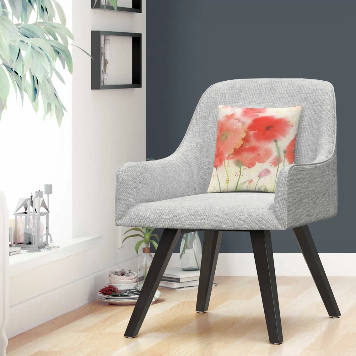 This decorative throw pillow features red flowers against a white background.