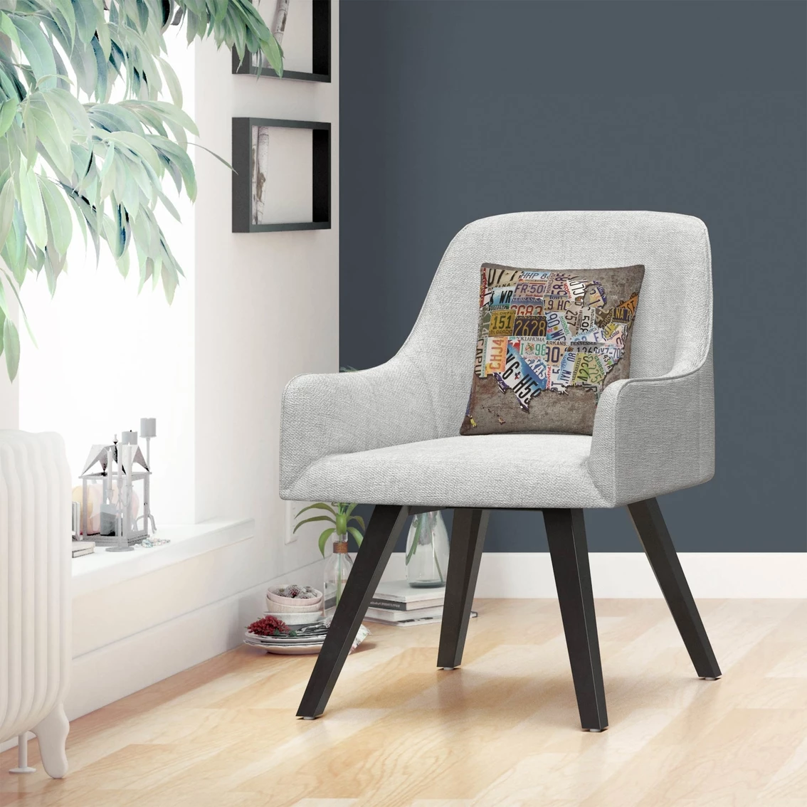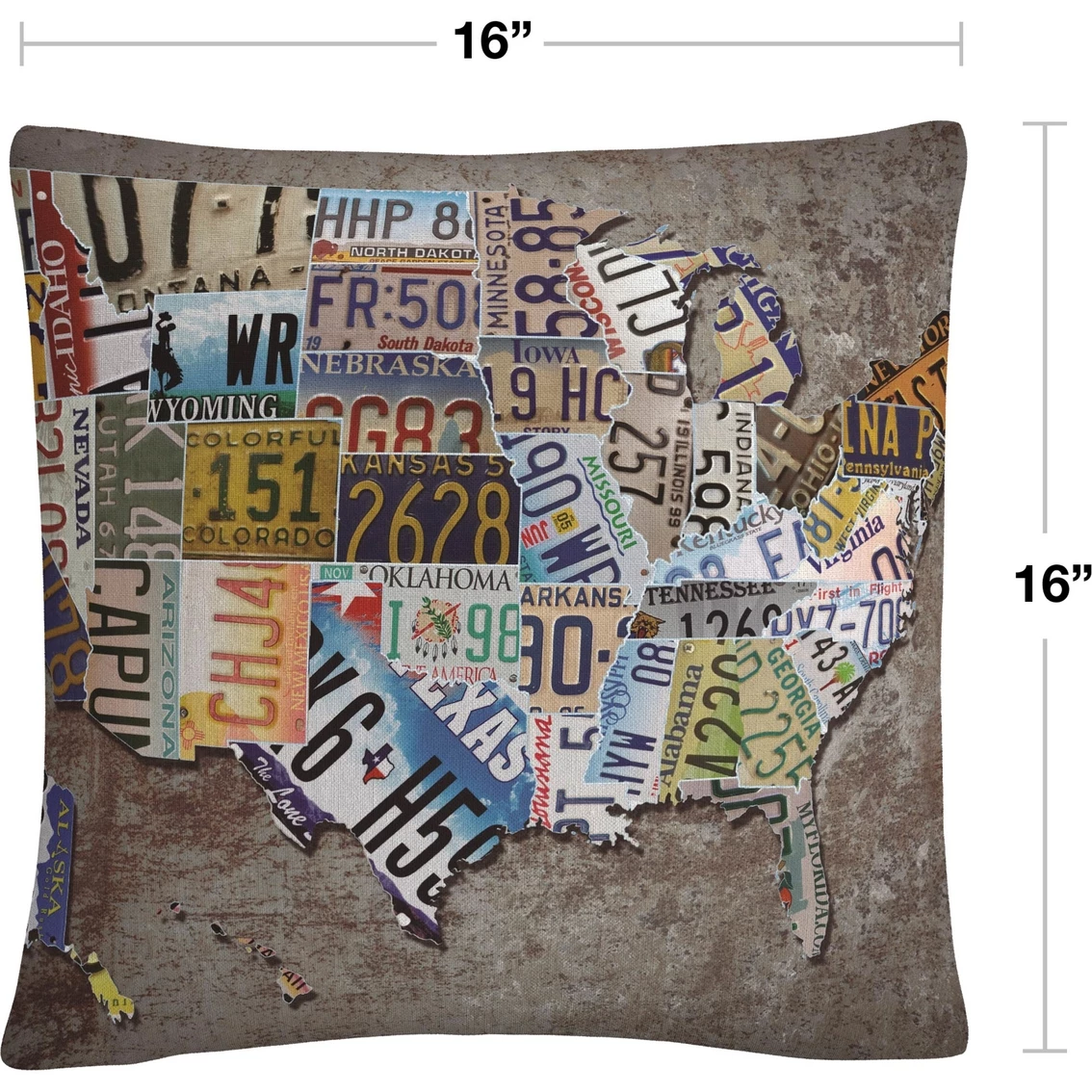 This chic and unique decorative throw pillow from Trademark Fine Art features a collage of license plates in the shape of USA on a distressed metal background by Masters Fine Art. Pillow includes a full color printed cover over a 100% American-made polyester pillow insert. The 16 x 16 in. square shape is perfect as a decorative accent on a bed, a statement piece on your favorite armchair or mixed and matched as your own curated collection on a couch or loveseat.