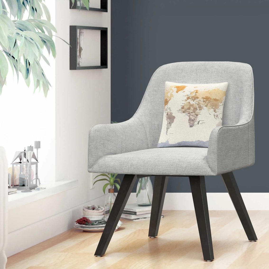 This decorative throw pillow features a watercolor map of the world.