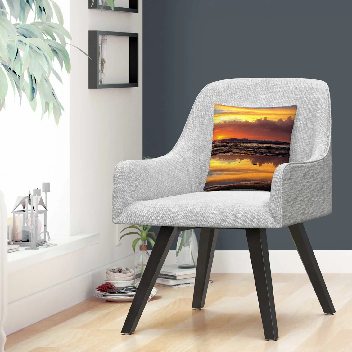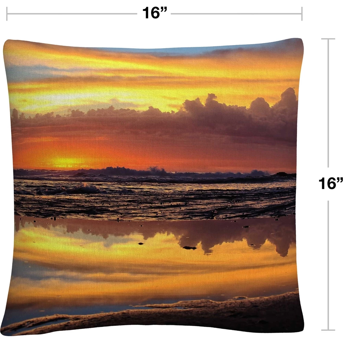 This decorative throw pillow features a beautiful sunrise over water. Artist: Beata Czyzowska Young. Subject: Landscape. Style: Contemporary. Prominent Colors: Brown, Orange, Black, Yellow, Tan. Made in USA.